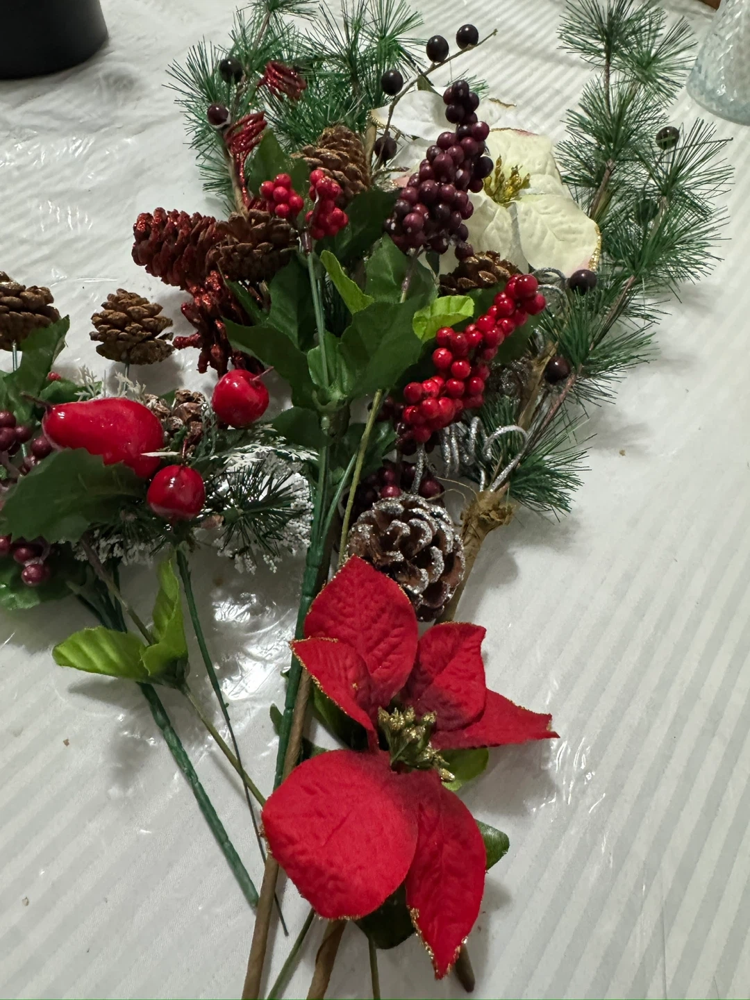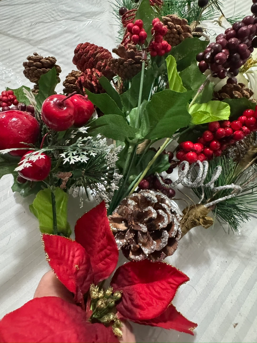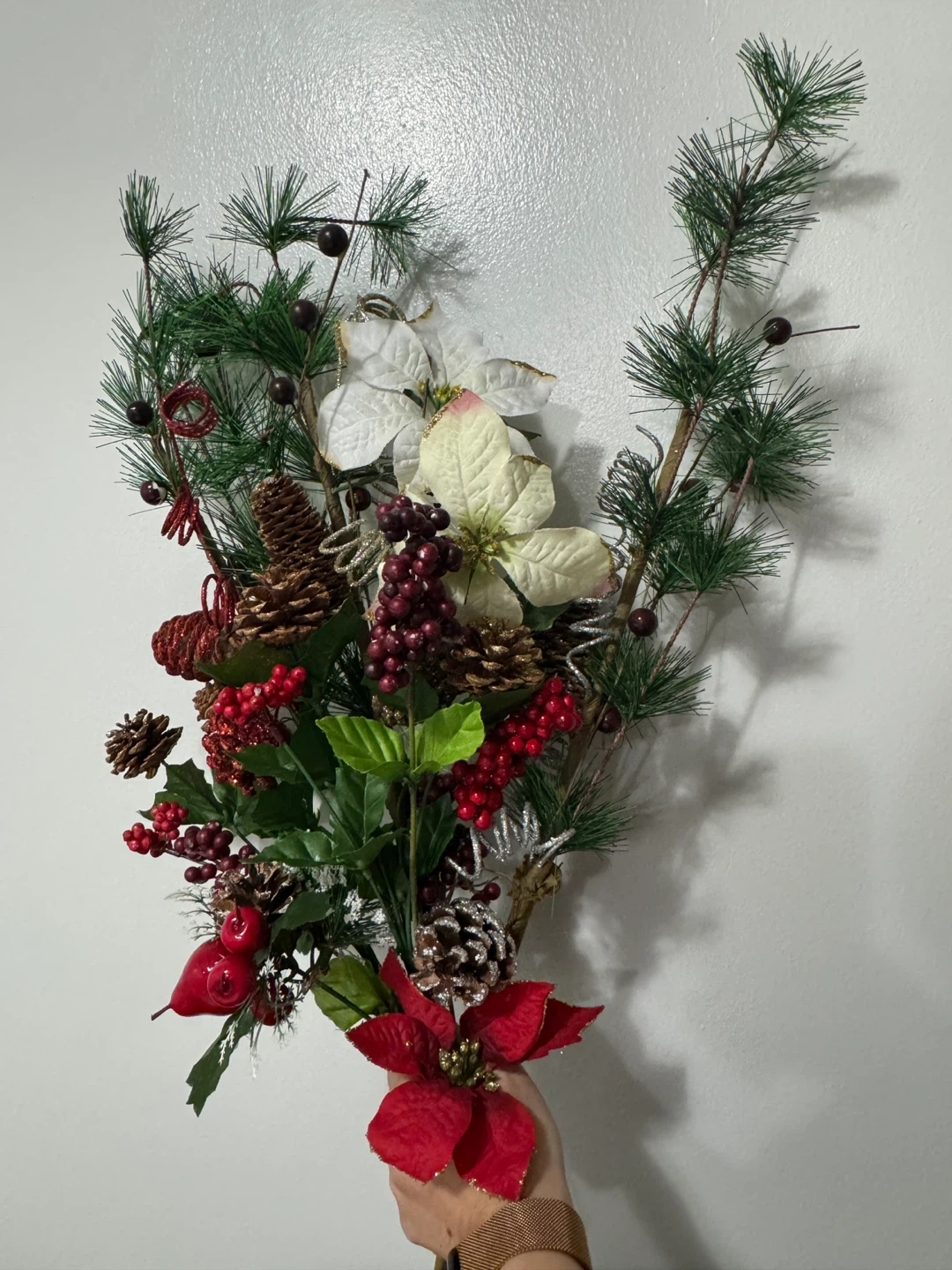 Festive arrangement with pine sprigs, pinecones, red berries, and poinsettias. It's great for adding a touch of holiday cheer to your home. A lovely way to decorate for the Christmas season!