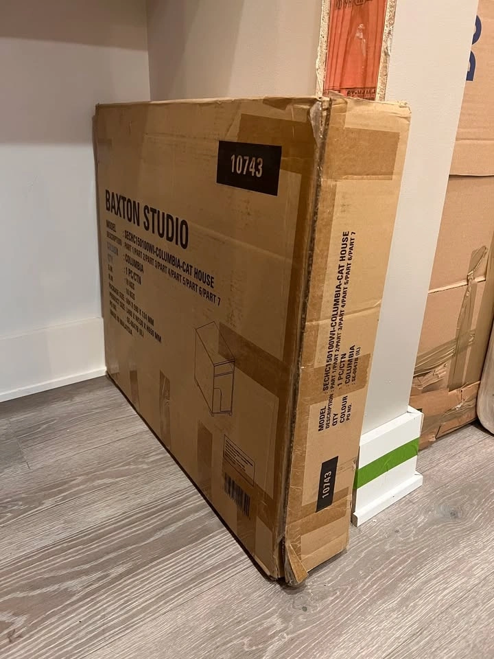 Bought years ago and never opened, now it is discontinued and I can't find an actual photo or listing of it. I am putting a photo of another so you can get a sense of the style, but this one is a vertical version so it can double as a side table (essentially you hide you cat's little box in it.) There's a photo on the box. If I recall the color is a medium walnut brown, similar to the example photo. I don't have the measurements, because it is still in the box.