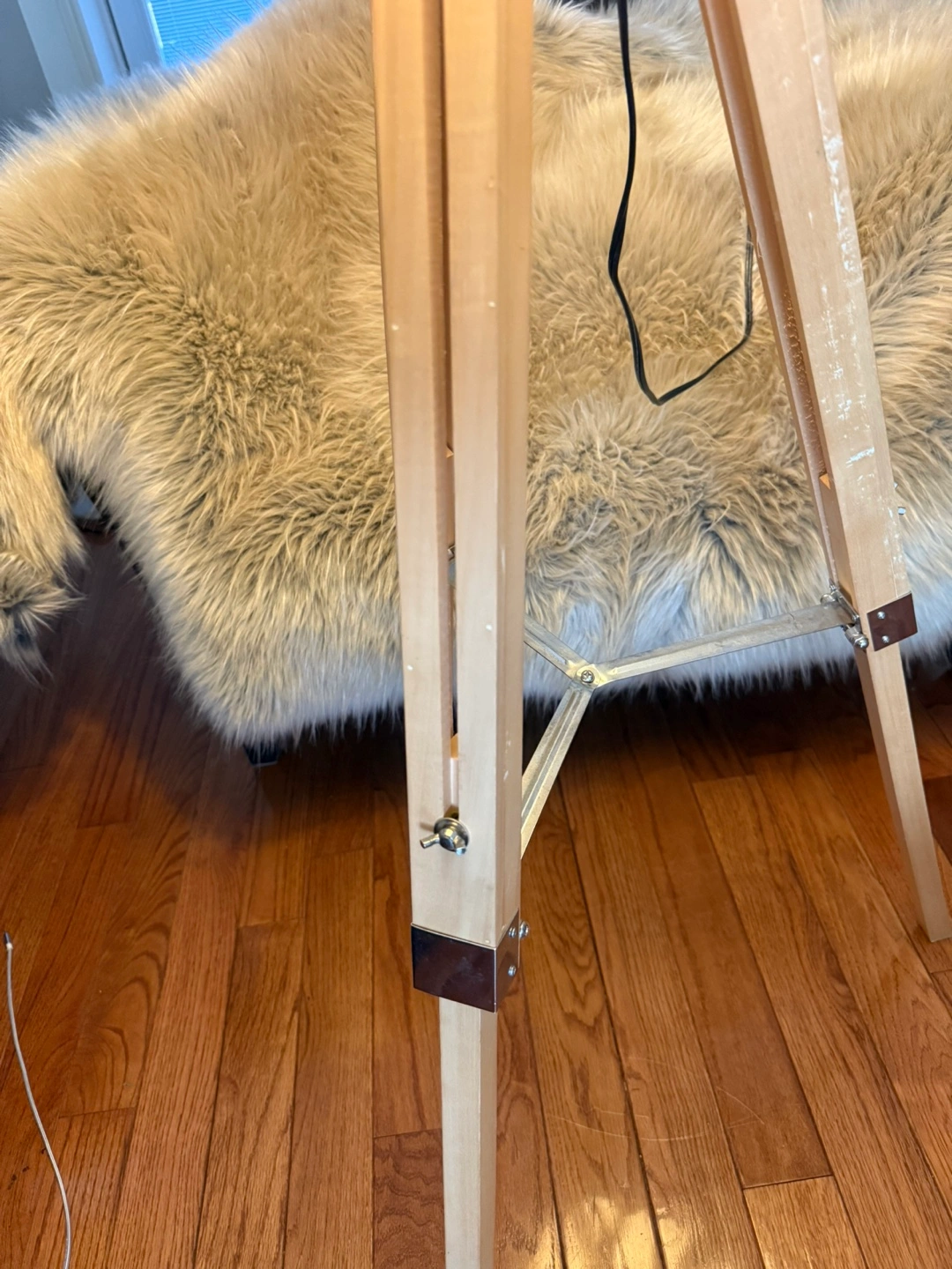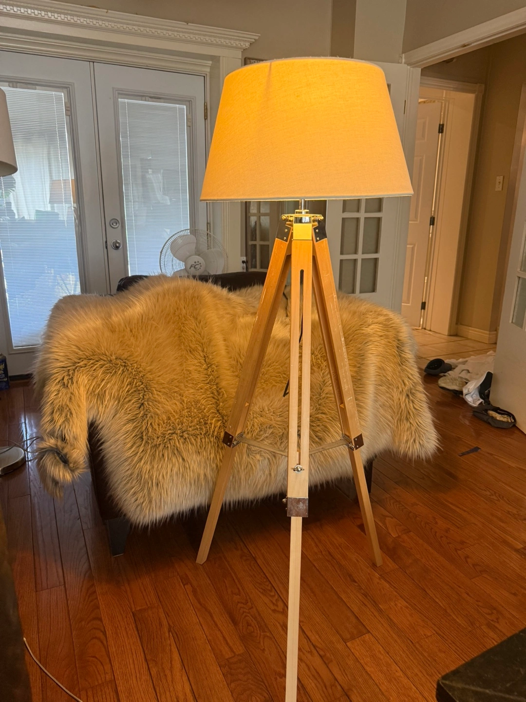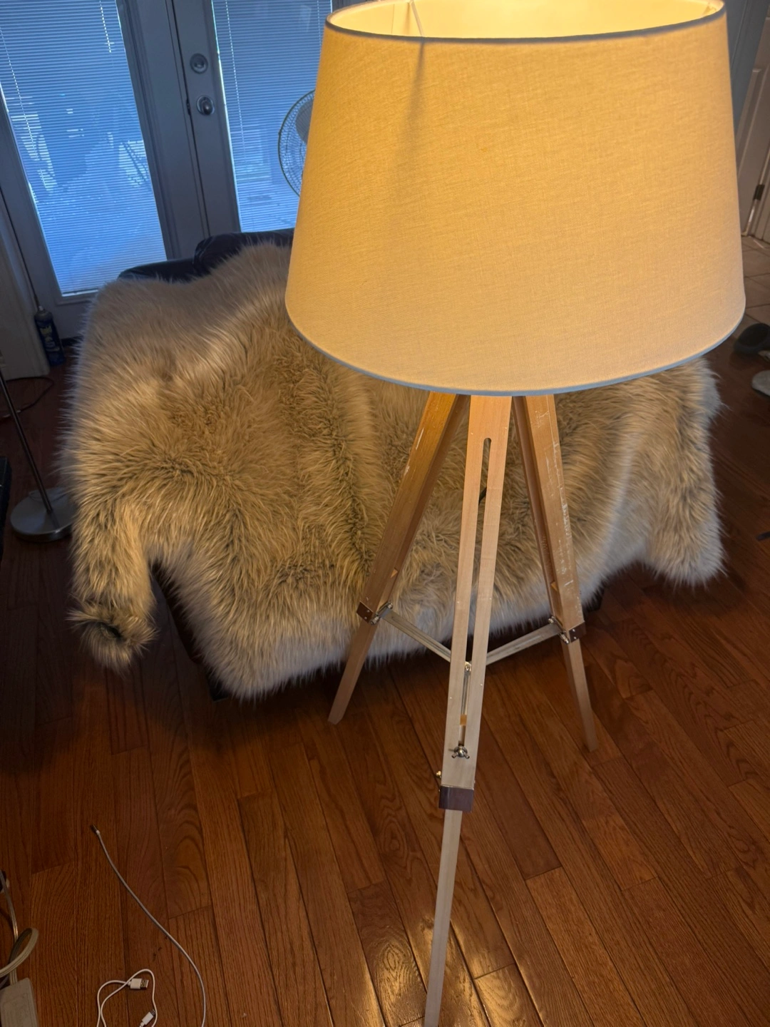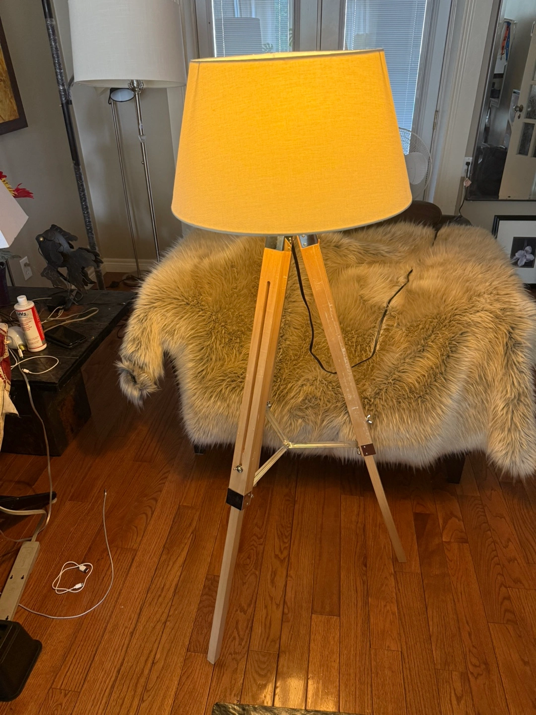 Selling a stylish tripod floor lamp! It has a neutral beige shade and a wooden tripod base. It's in great condition and would look lovely in any living room or bedroom. Some marks on leg
