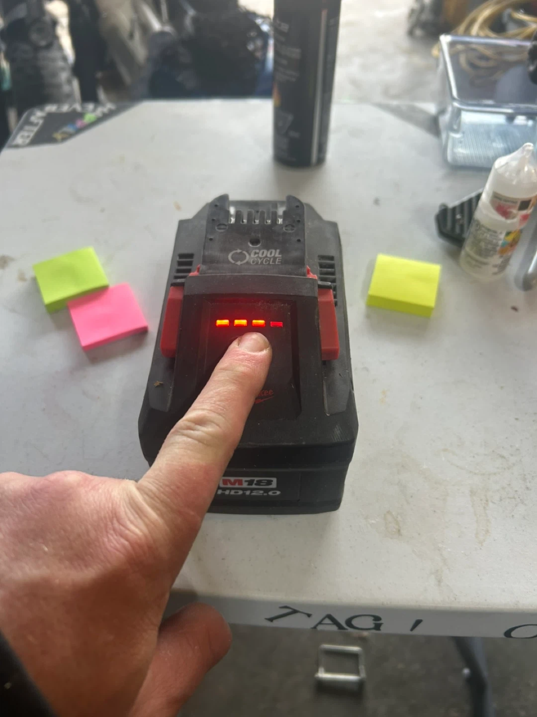 Used Milwaukee M18 REDLITHIUM FORGE HD12.0 battery. It's a 12.0 Amp Hour battery with cool cycle technology. The battery shows 3 out of 4 charge indicators.