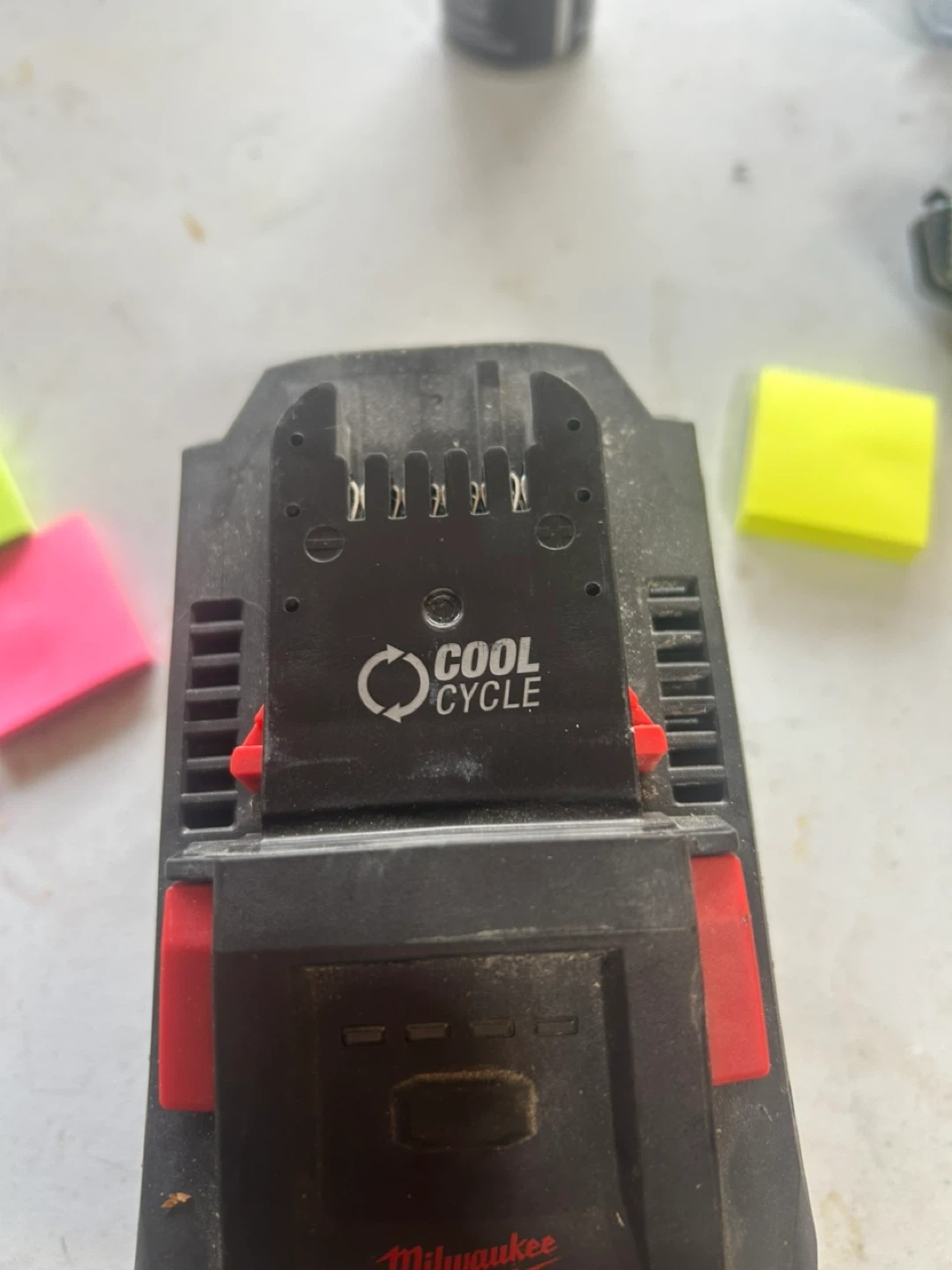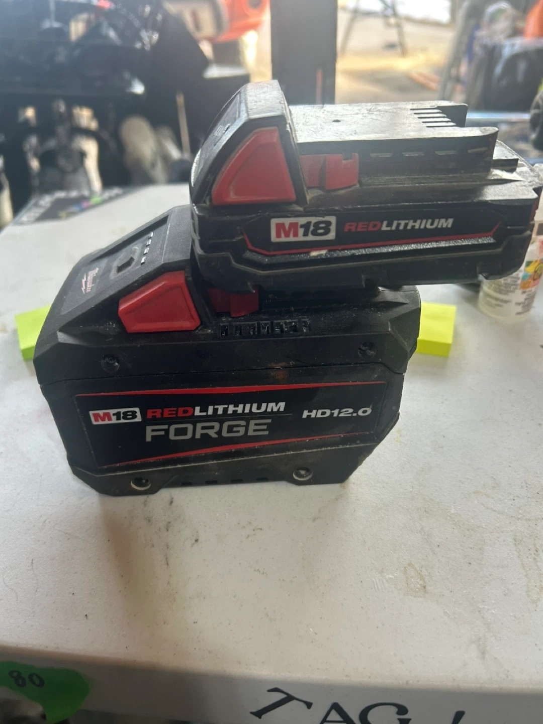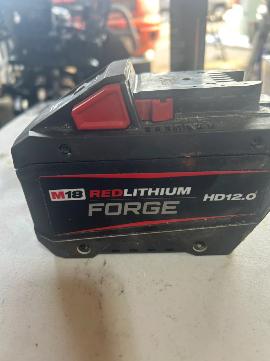 Used Milwaukee M18 REDLITHIUM FORGE HD12.0 battery. It's a 12.0 Amp Hour battery with cool cycle technology. The battery shows 3 out of 4 charge indicators.