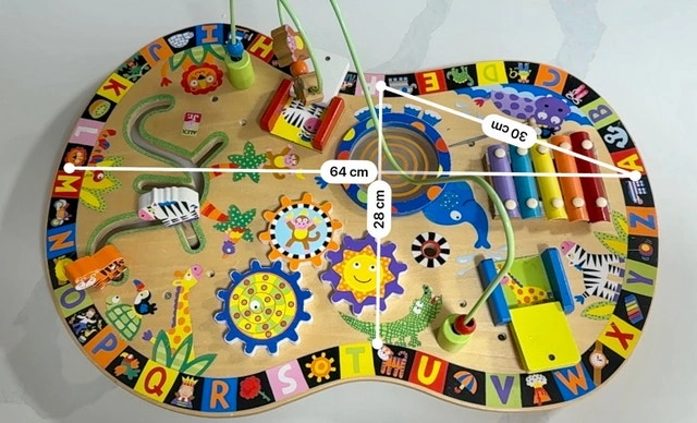 Colorful wooden activity board from ALEX Jr. Lots of fun stuff for little ones to explore. Has a xylophone, spinning gears, bead maze, and animal alphabet border. Good for motor skills and keeping babies/toddlers busy. About 64 cm wide and 28 cm tall. Note: I made the base from timber for better stability.