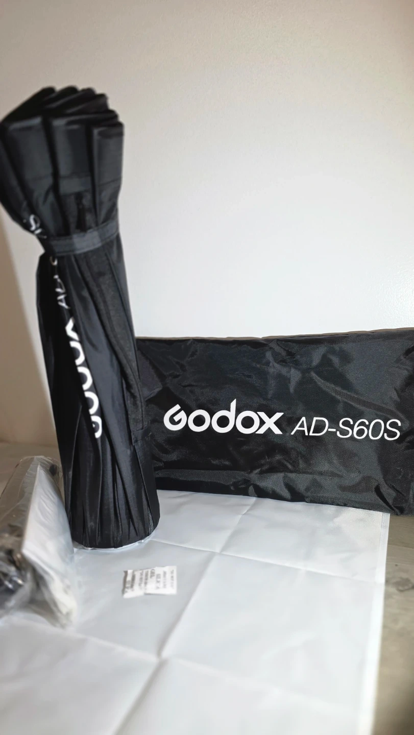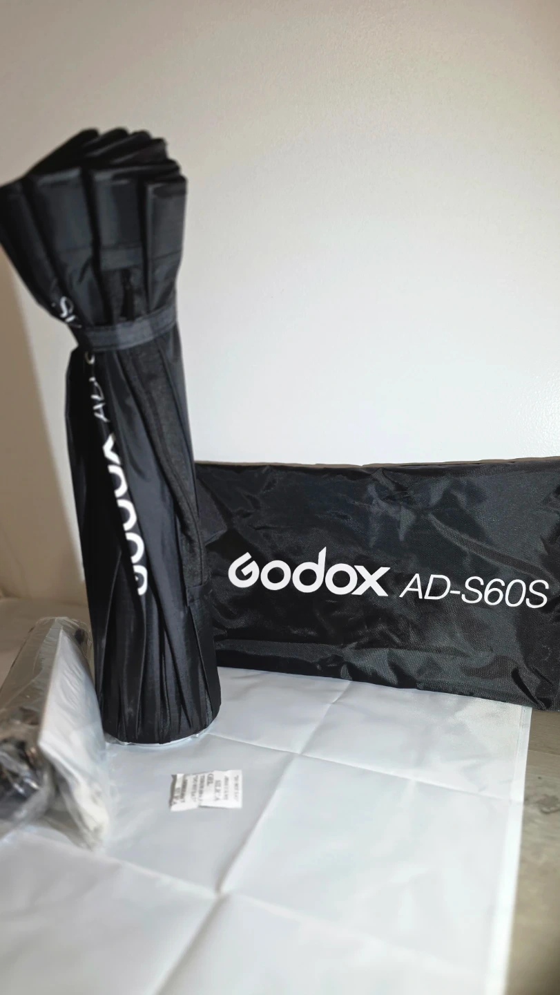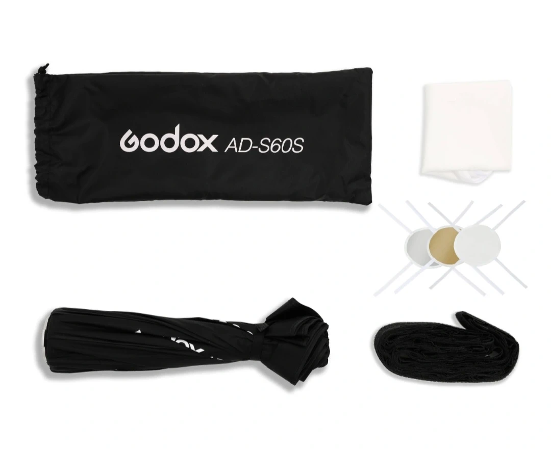 This Godox AD-S60S softbox umbrella kit comes with a carrying bag. It's designed for photography lighting. Includes diffusion cloth and grid accessories.