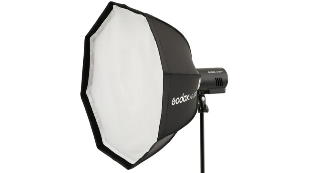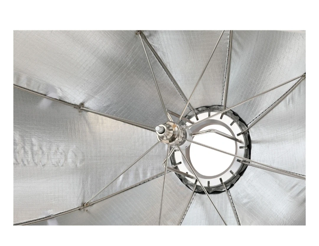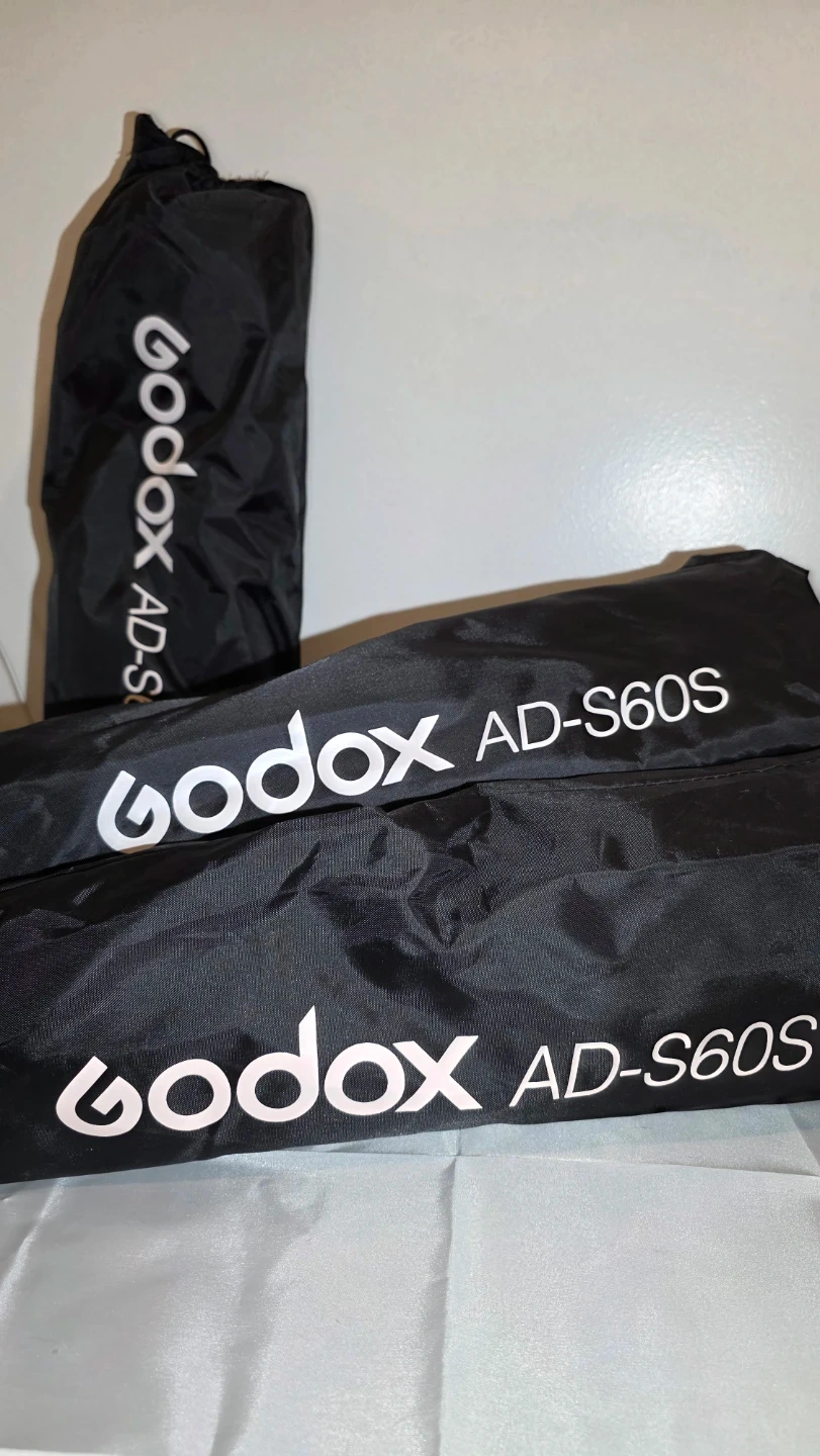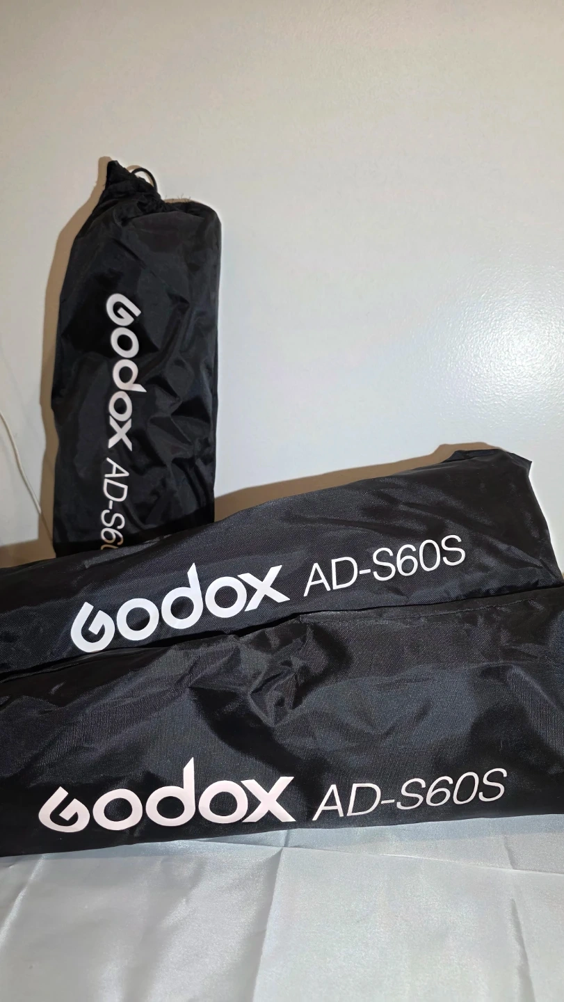 Este kit de softbox tipo paraguas Godox AD-S60S incluye una bolsa de transporte. Está diseñado para iluminación fotográfica e incluye tela difusora y accesorios de rejilla.