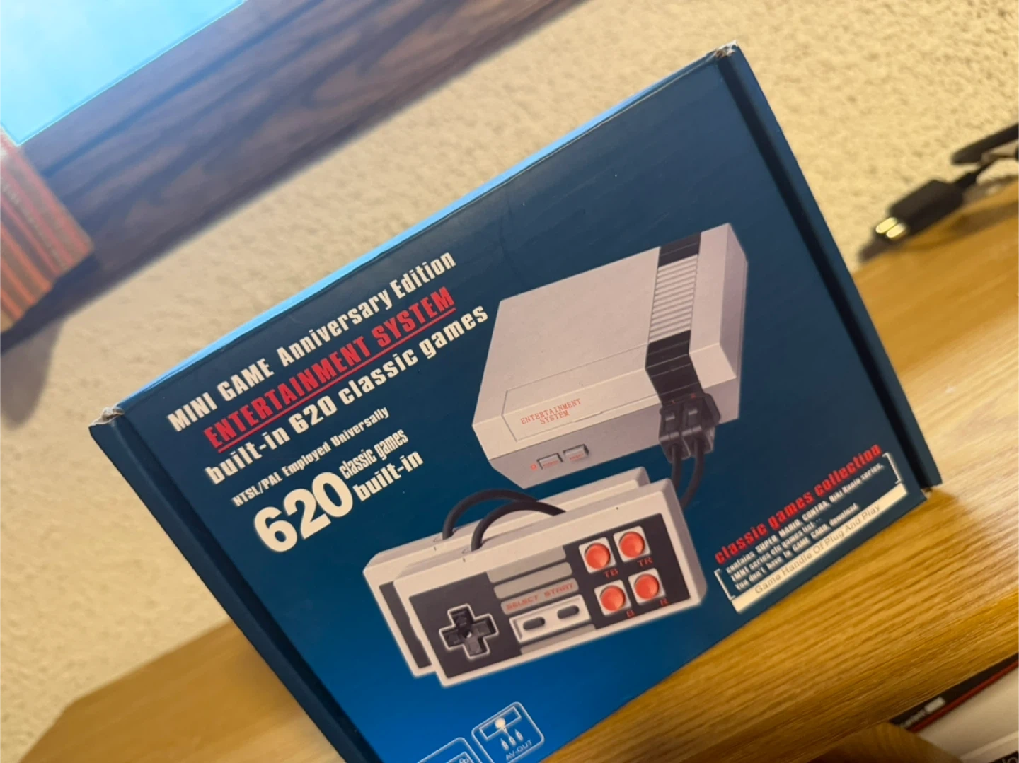This is the Mini Game Entertainment System Anniversary Edition. It's built-in with 620 classic games and supports NTSC/PAL. The collection includes titles like Super Mario, Contra, and more. It's a plug-and-play system with AV output.
