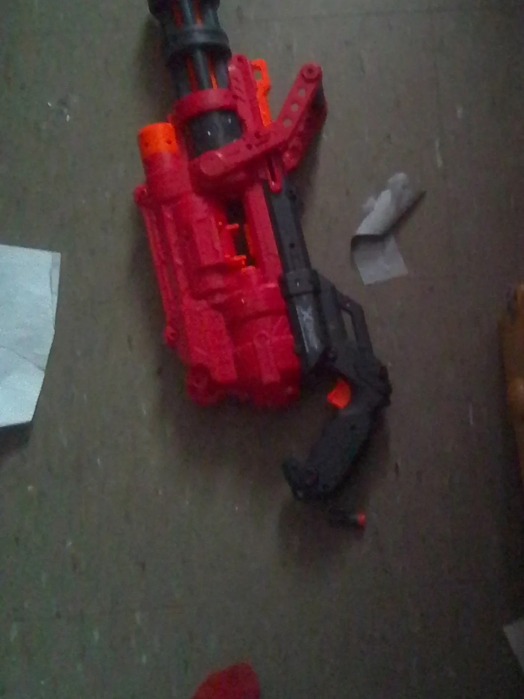 It's a red and black Nerf N-Strike Mega Cycloneshock blaster. This toy features a rotating barrel that holds up to six mega darts. It's great for backyard play!