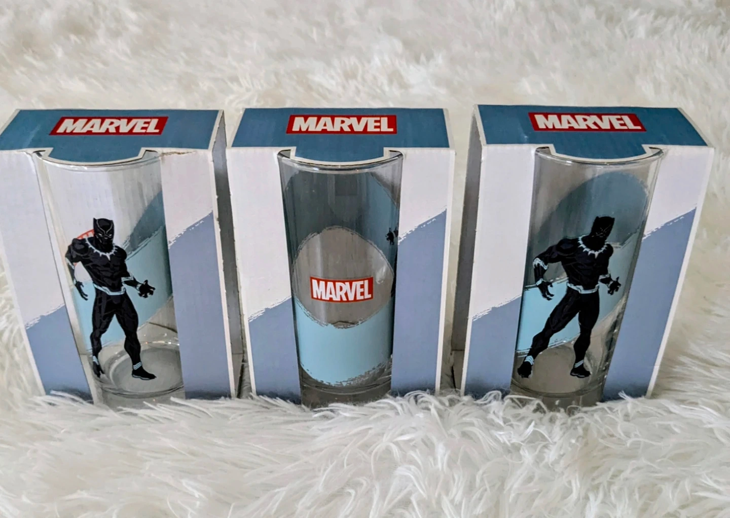 Set of three Marvel Black Panther glasses. Each glass features a design of the Black Panther character. These glasses come in their original boxes.