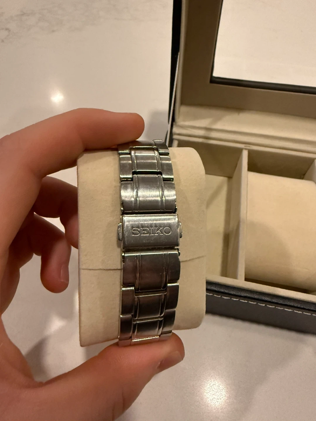 Seiko men’s watch with blue dial and stainless steel bracelet.