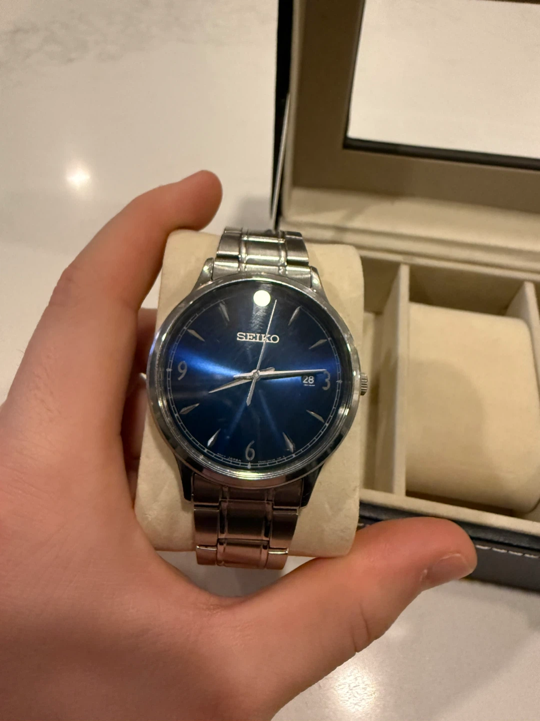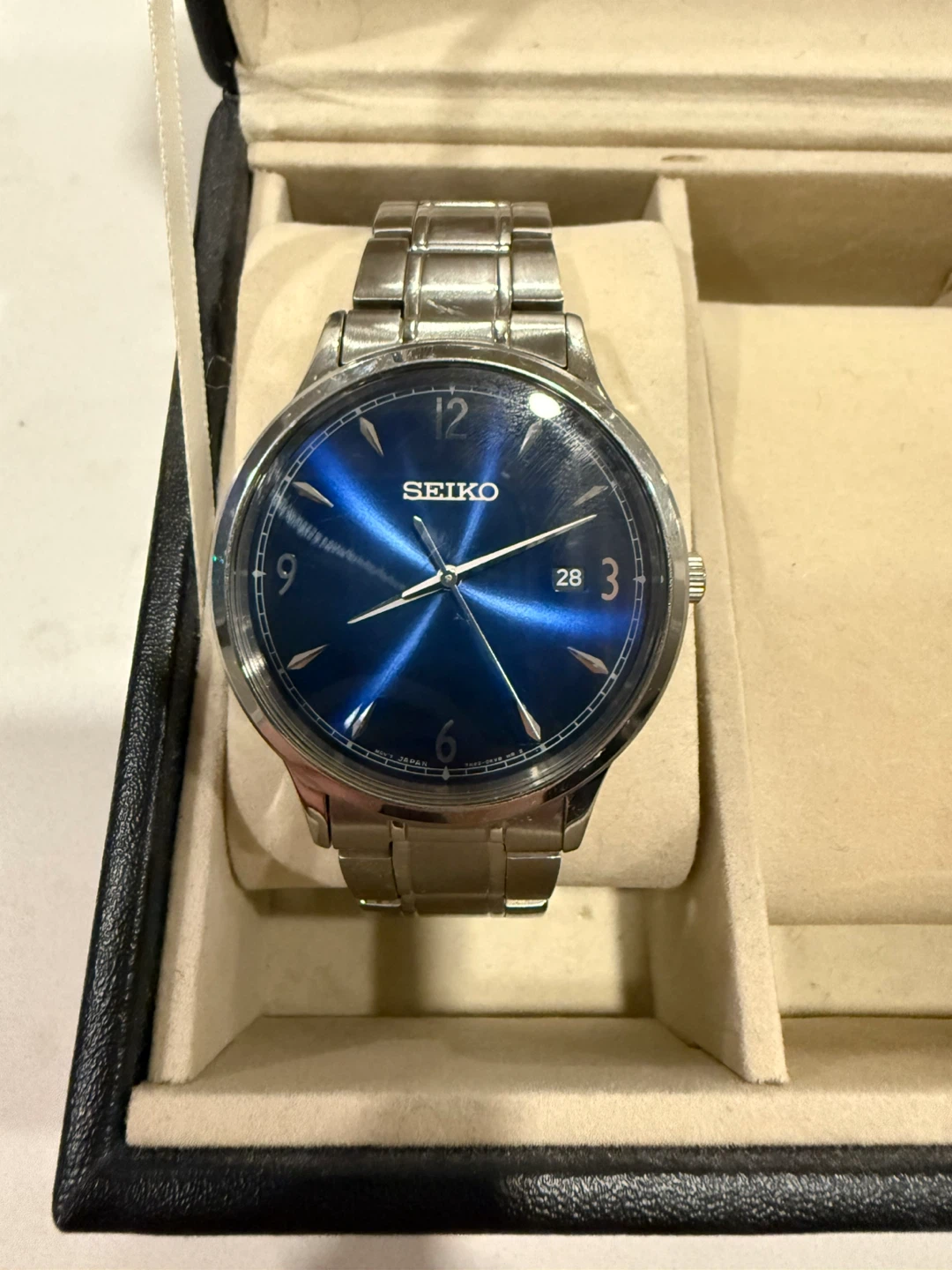 Seiko men’s watch with blue dial and stainless steel bracelet.