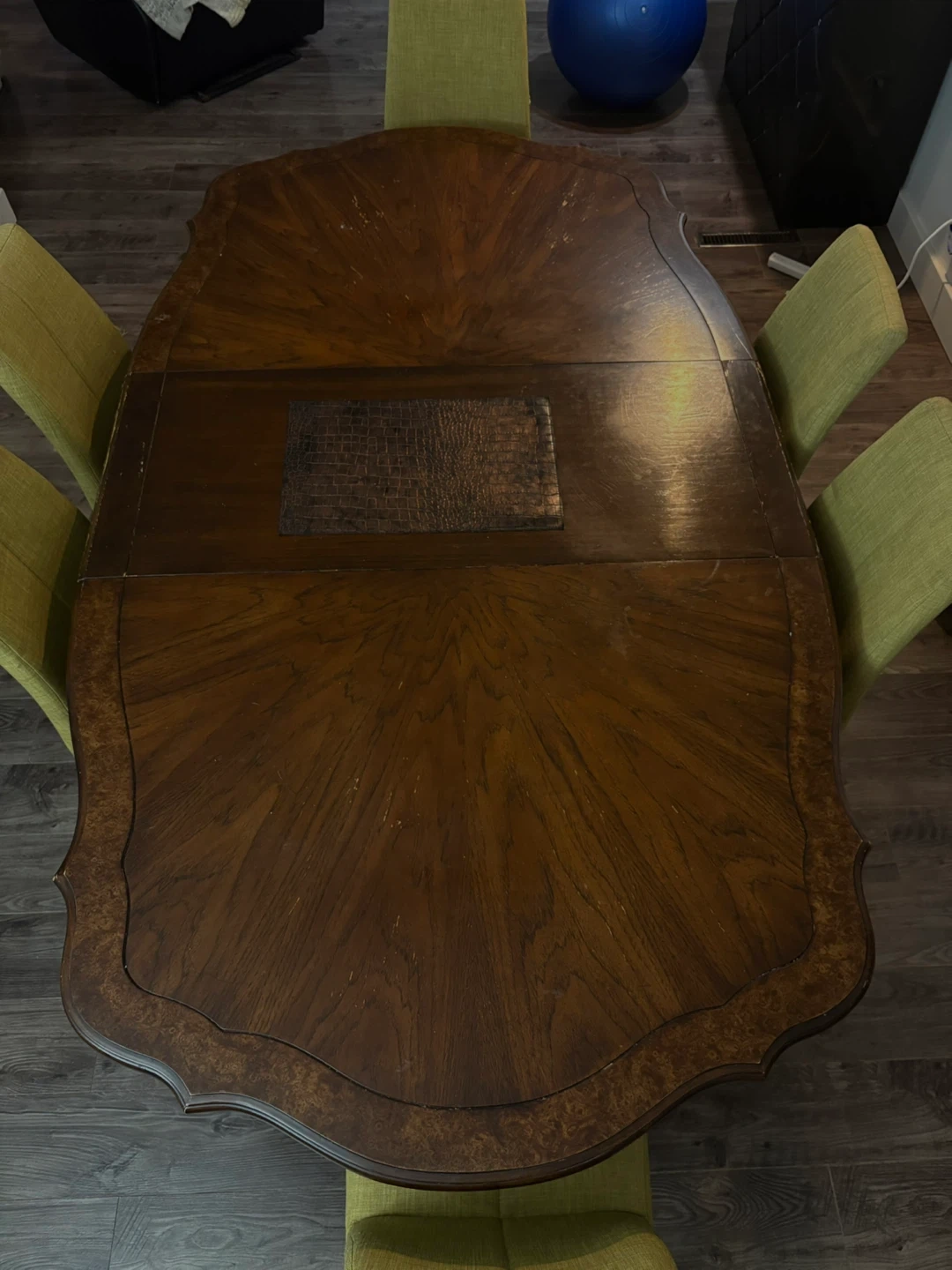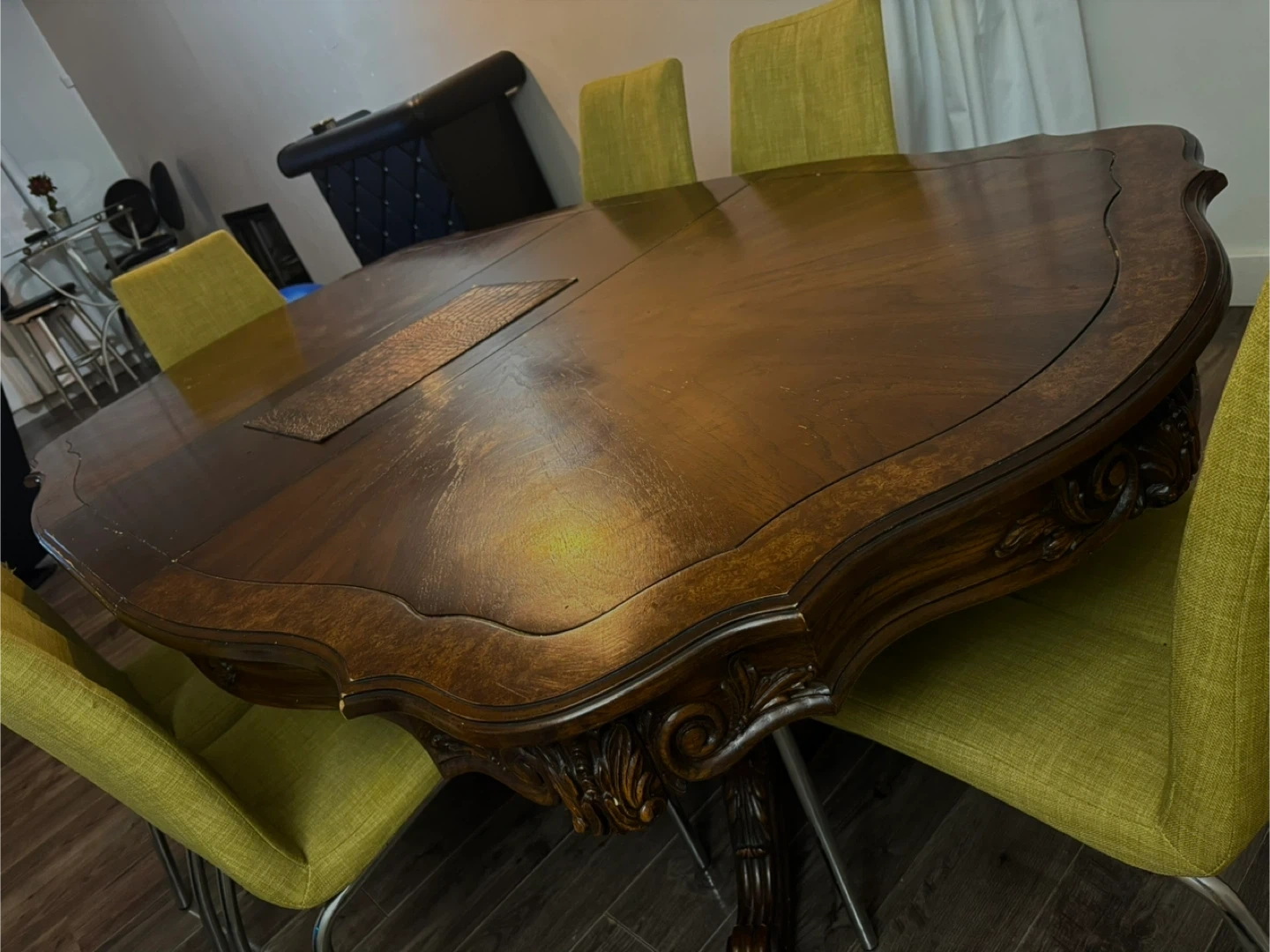 This is a large oval dining table with an ornate wood design. It appears to have extension leaves that can be added or removed. The table is dark brown wood with carved details on the legs and edges. It comfortably seats six chairs but can accommodate more.