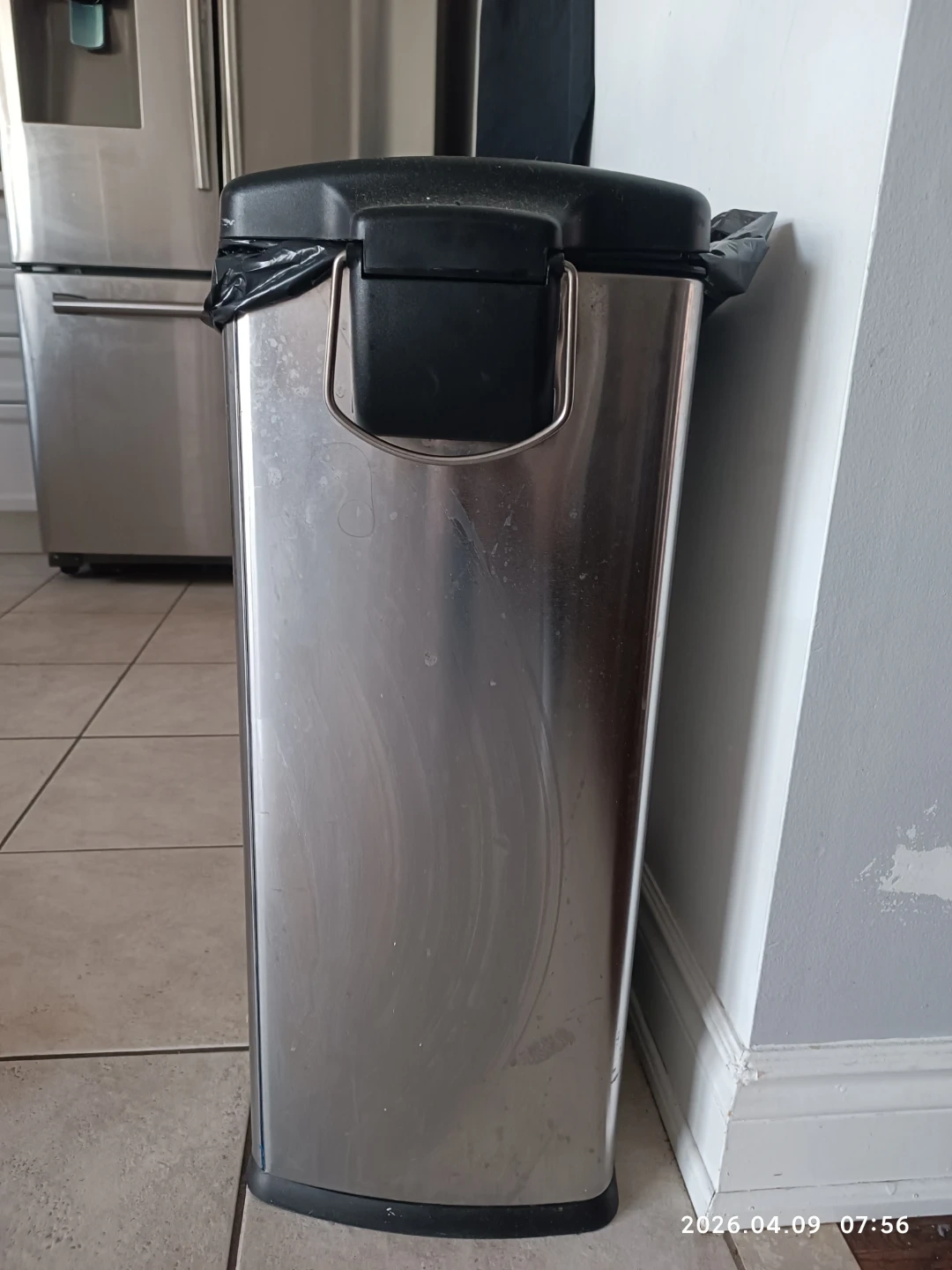 This is a stainless steel step trash can with a black lid. It has a foot pedal for hands-free operation. It's a good size for a kitchen or office.