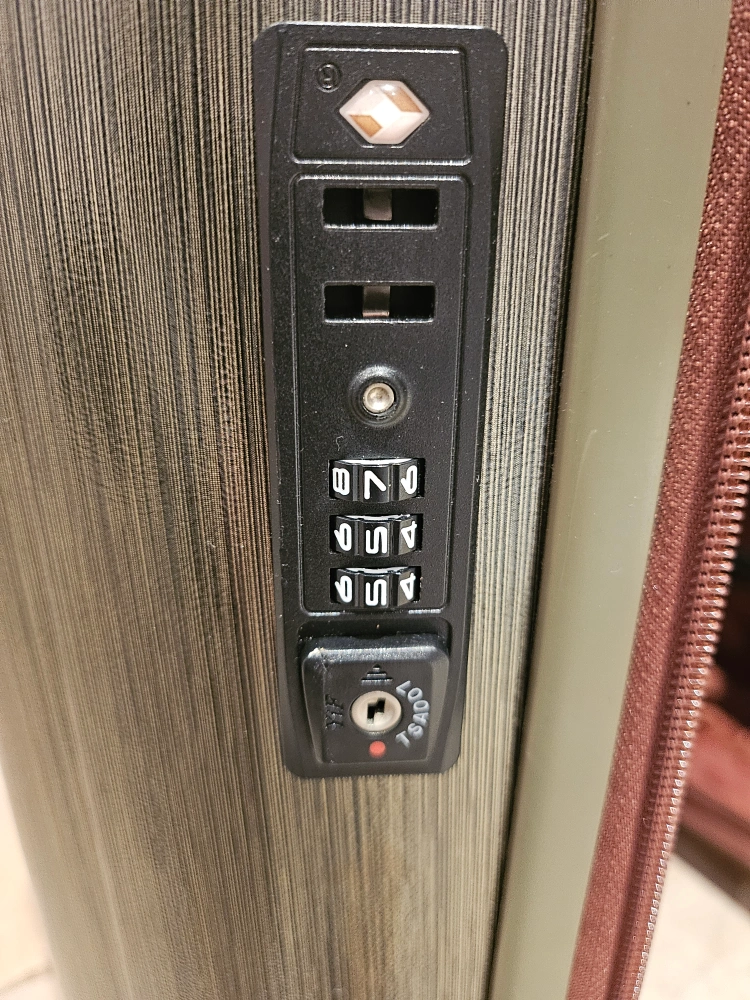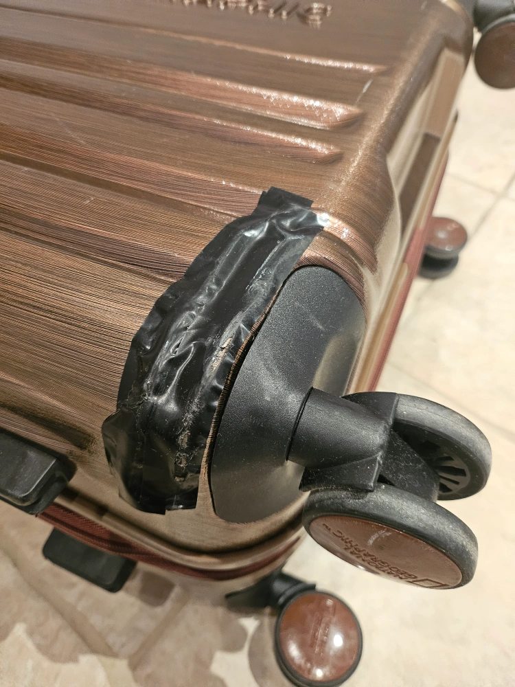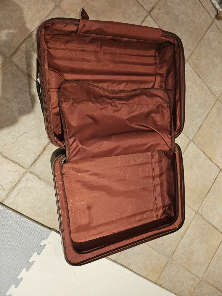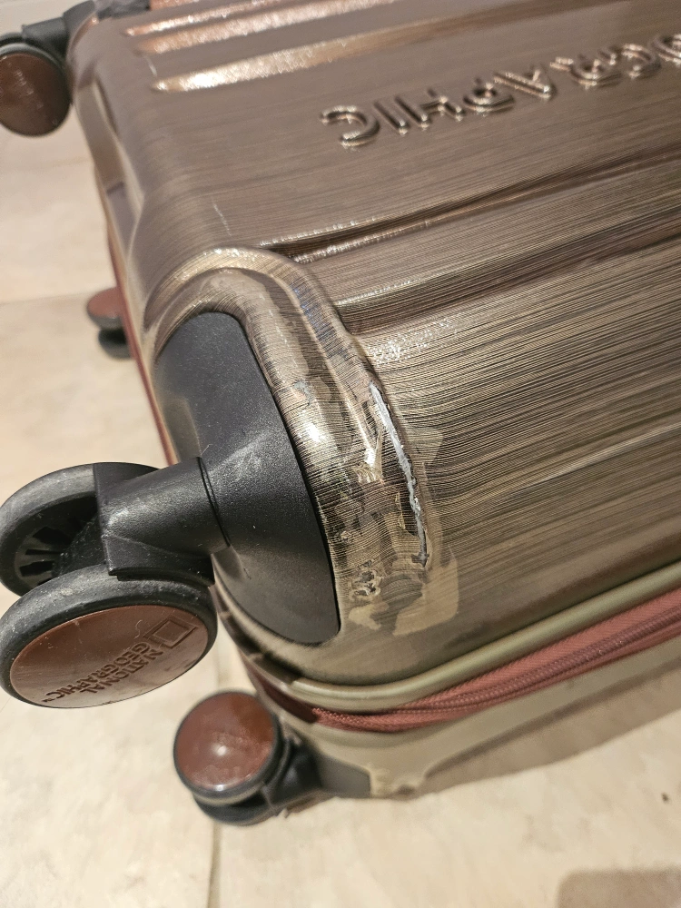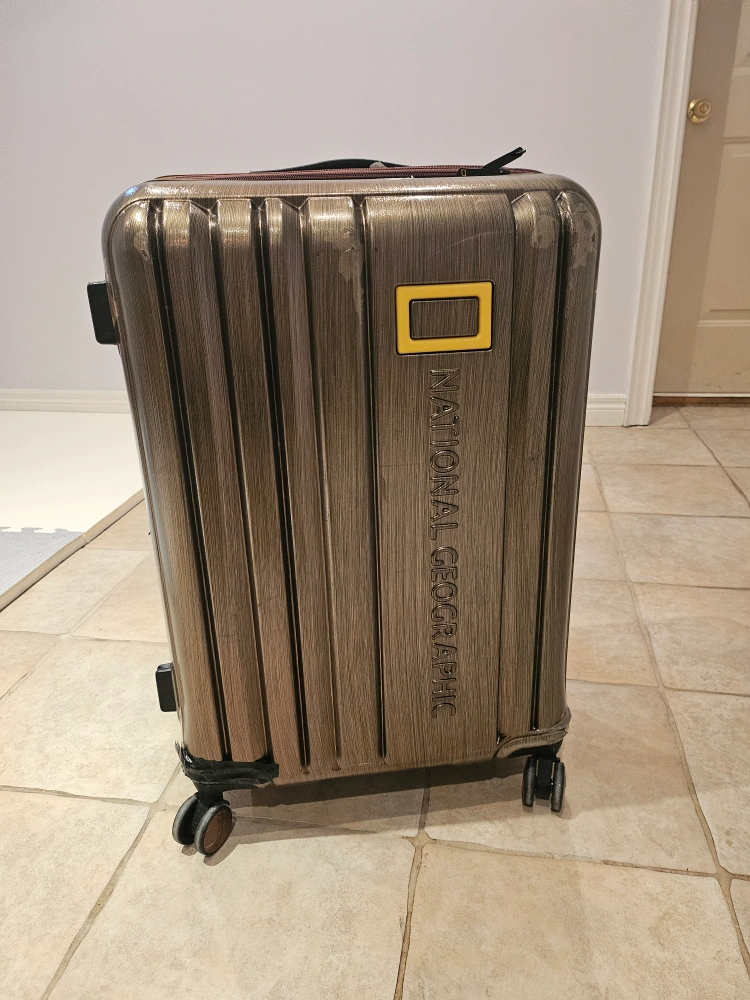 Used National Geographic suitcase. Bronze coloured hard shell. Minor scuffs and scratches. Wheels and handle are functional. Some cosmetic damage repaired with tape.