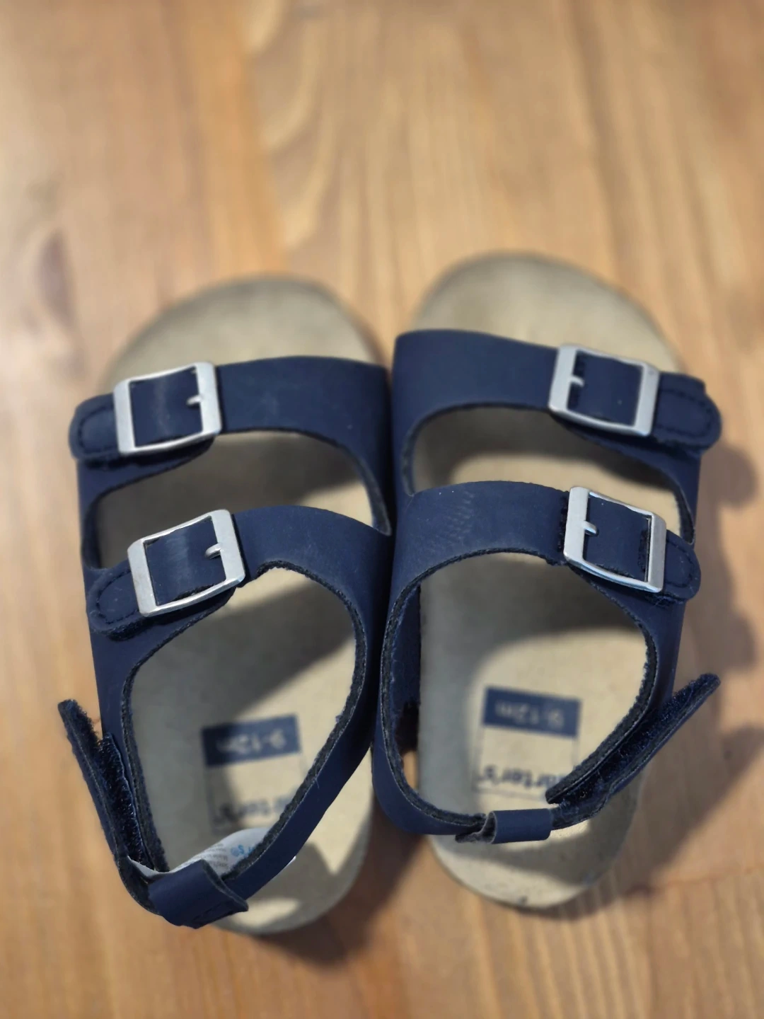 These are navy blue Carter's sandals with buckle and velcro closures. They're a size 9-12 months. The footbed appears to be cork.