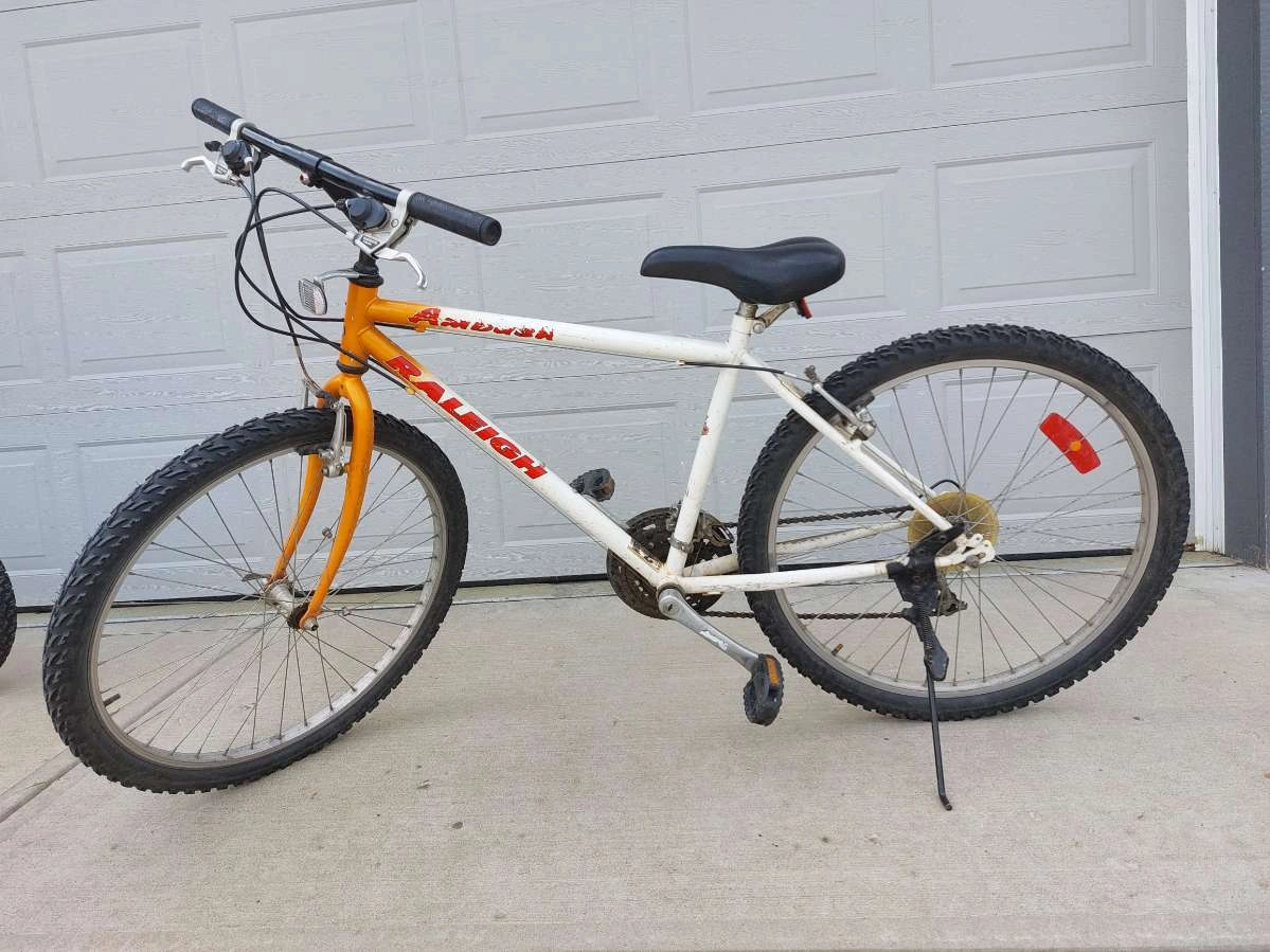 Selling an adult-size Raleigh mountain bike. Old but still rides fine. One brake needs fixing, but everything else works. Great for casual rides or as a project bike.