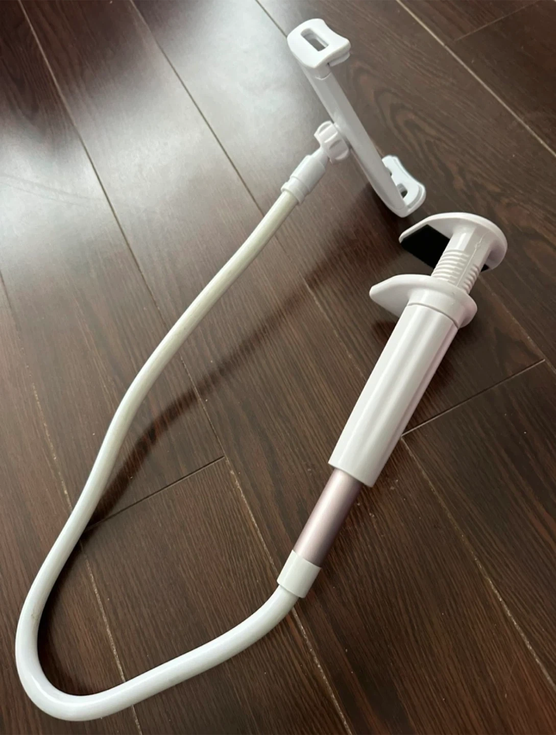 This white holder is for phones and tablets. It features a flexible gooseneck arm and a sturdy clamp base. The holder arms are adjustable for different device sizes.