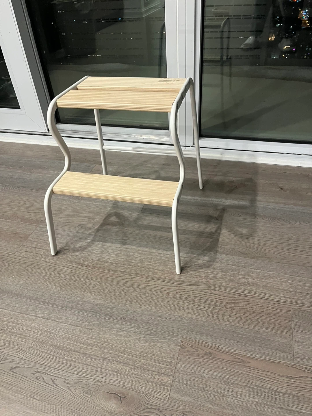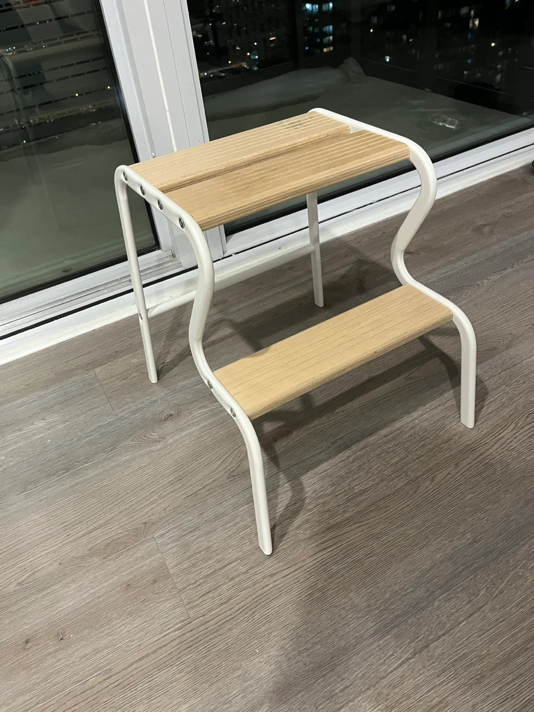 A simple two-tier step stool with wooden steps and a white metal frame. It's useful for reaching higher shelves or as a small aid. The design is compact and functional.