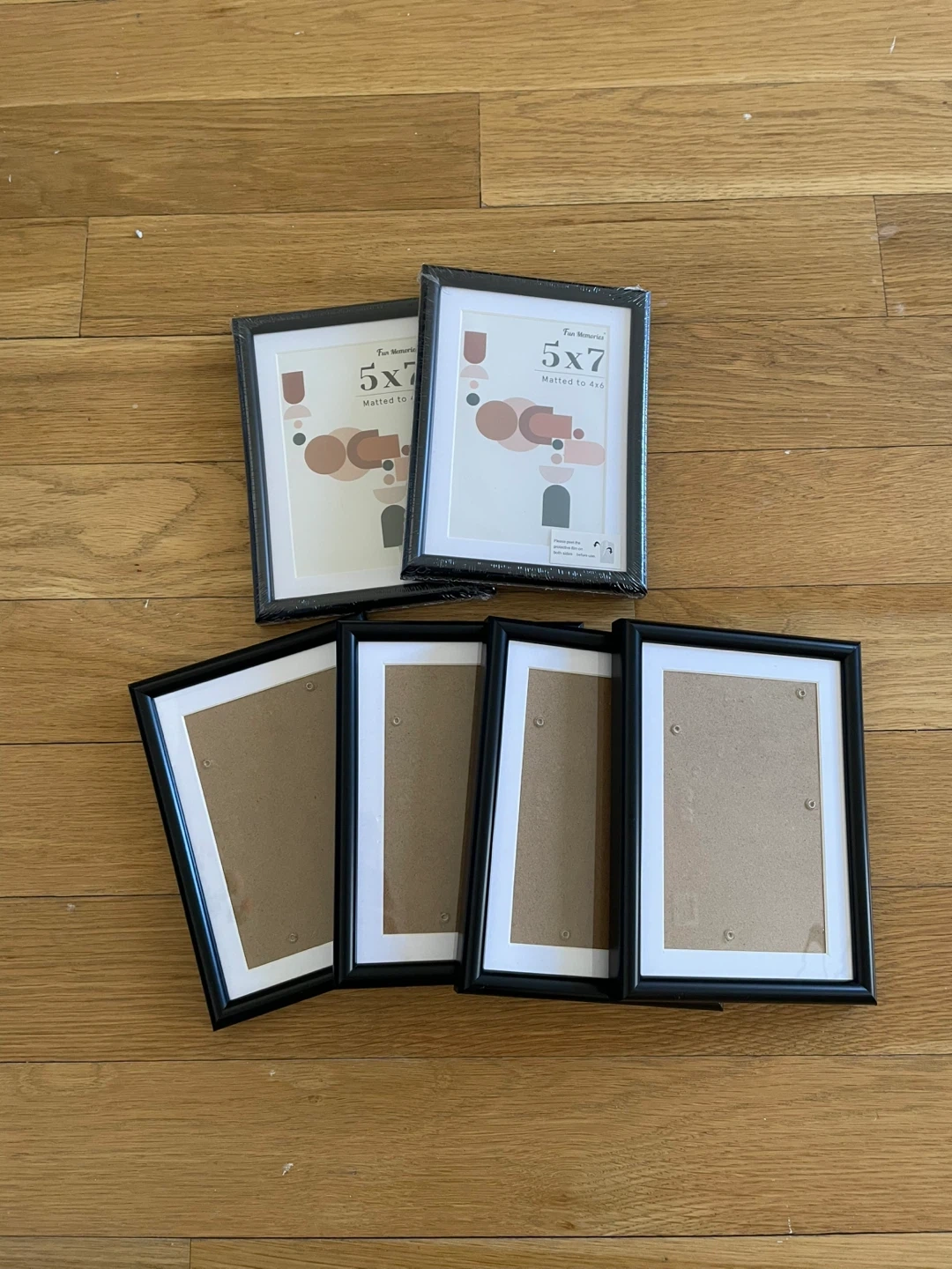 This is a set of five black photo frames. Two are still in original packaging. Each frame is designed to hold a 5x7 photo and can be matted to 4x6. They're made of plastic with a glass or clear plastic front.