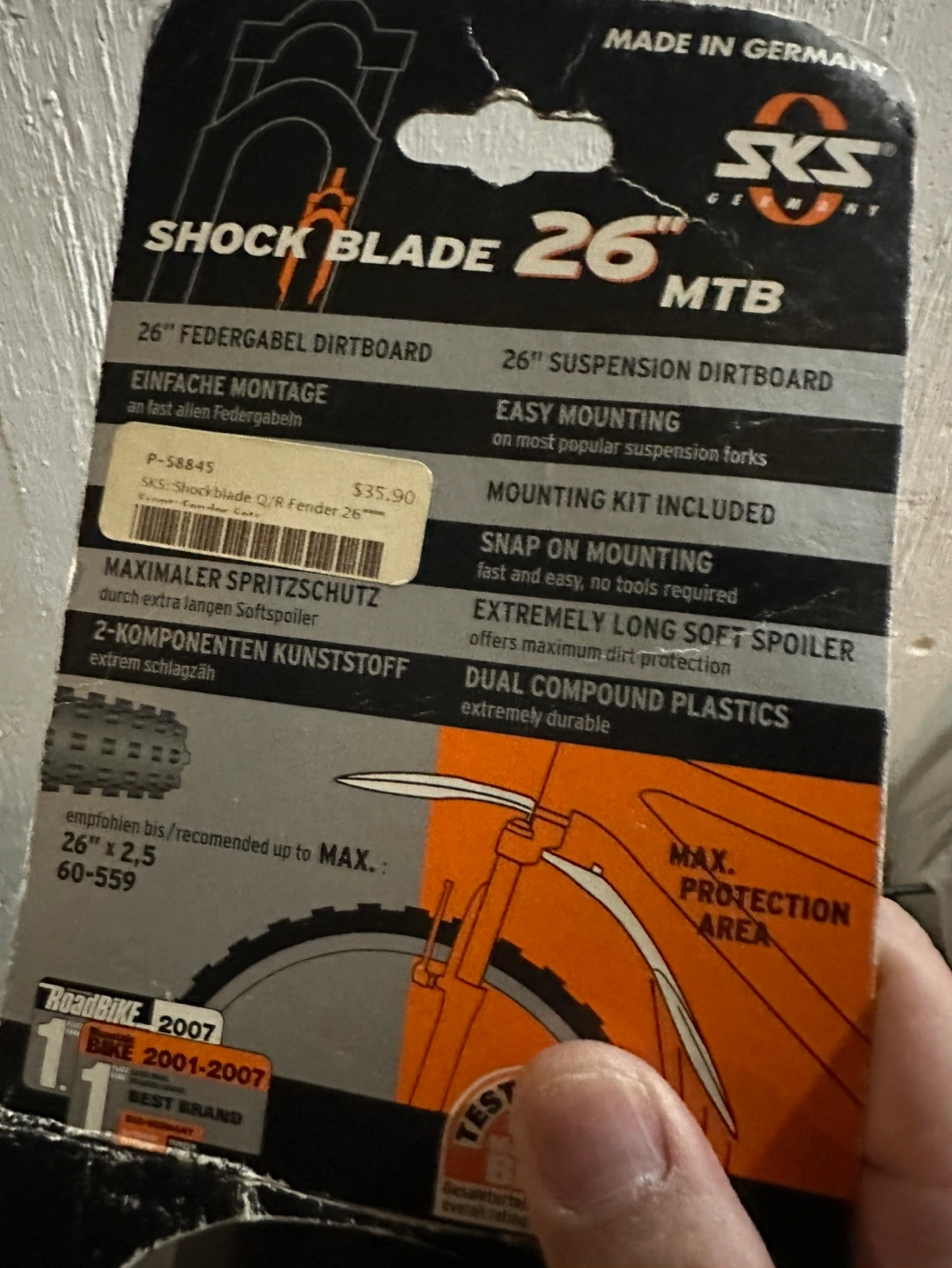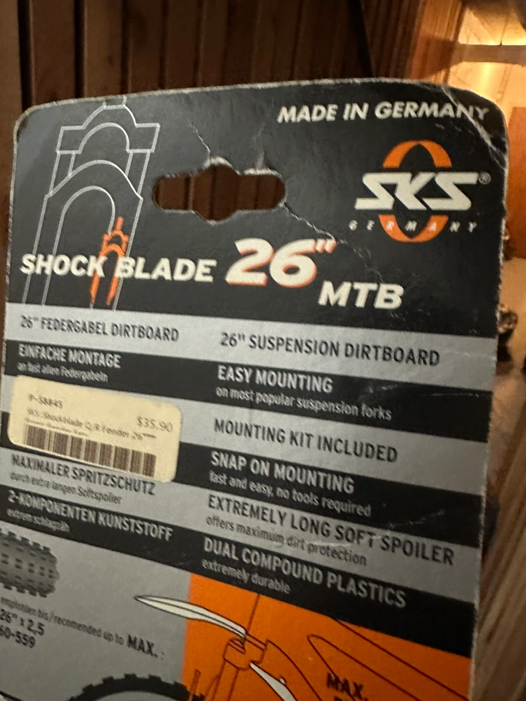 New in package. 26" suspension dirtboard. Easy mounting. Snap on mounting kit included. Extremely long soft spoiler. Dual compound plastics. Made in Germany.