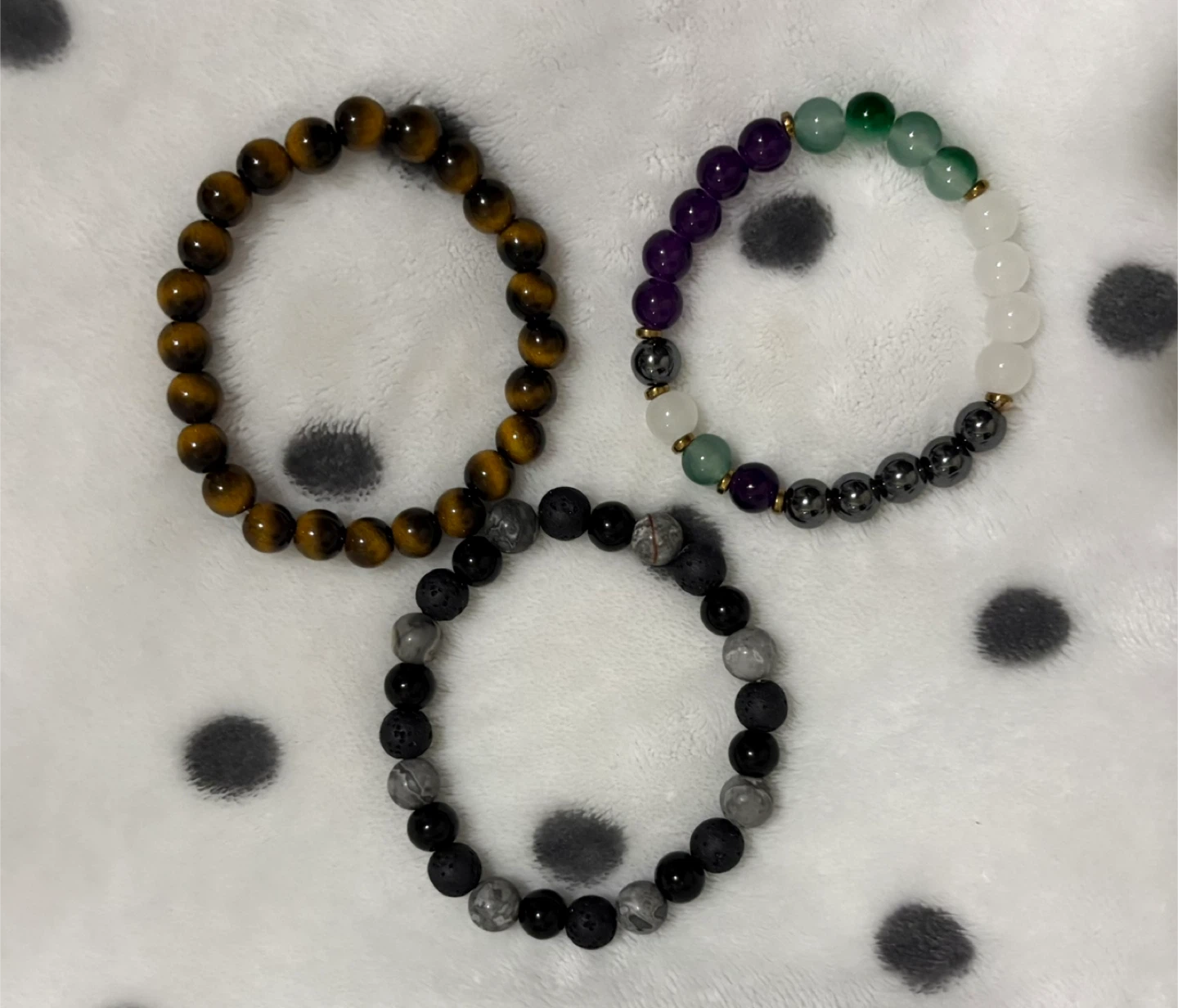 One is tiger's eye, another is a mix of purple, green, white and black beads, and the third is black and grey lava rock beads.