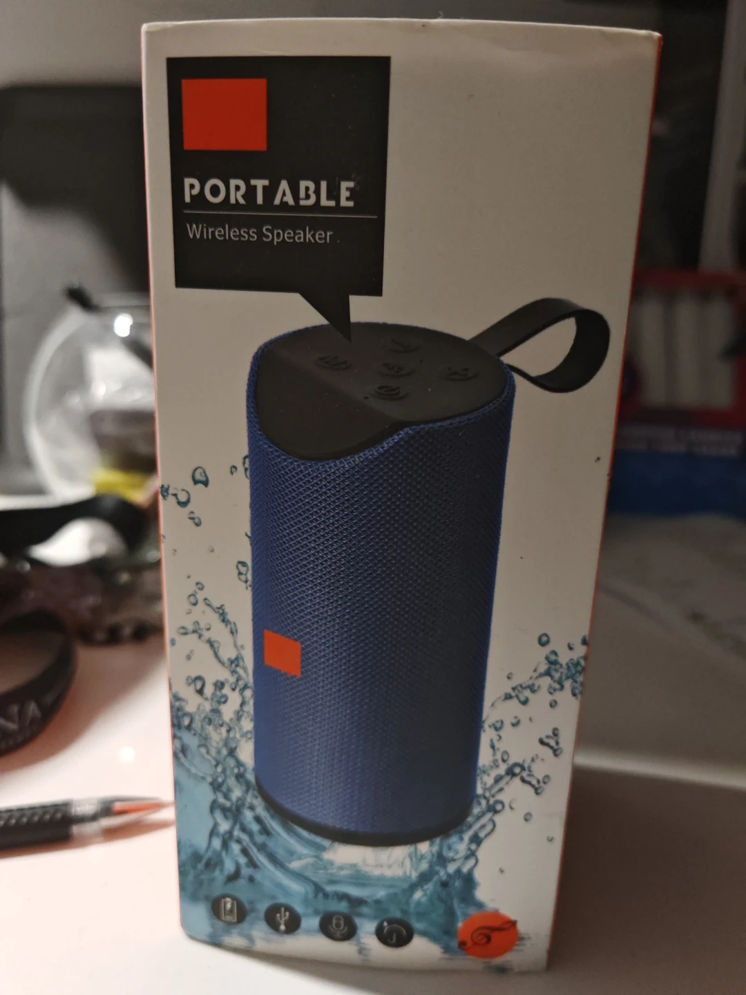 This portable wireless speaker is black. It's suitable for use through Bluetooth. Playtime 3-4 hours according to box
