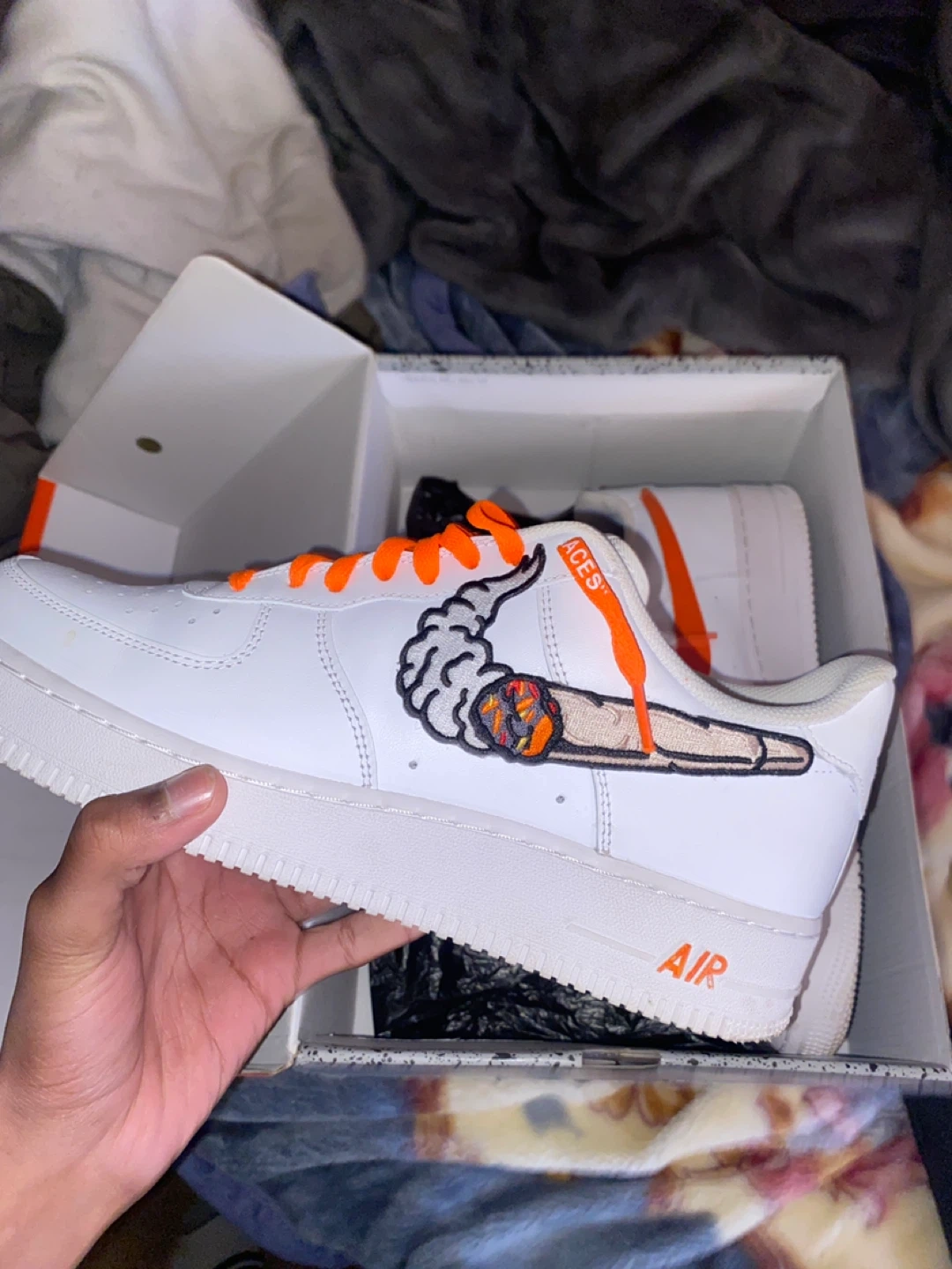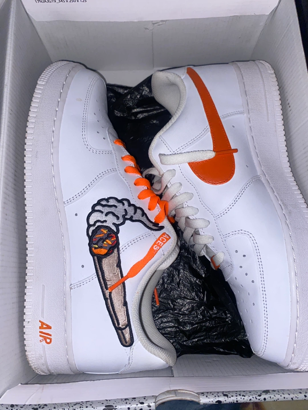 White Nike Air Force 1s with custom "joint" graphic on the side and orange laces. Includes original box. Some scuffing on the soles.