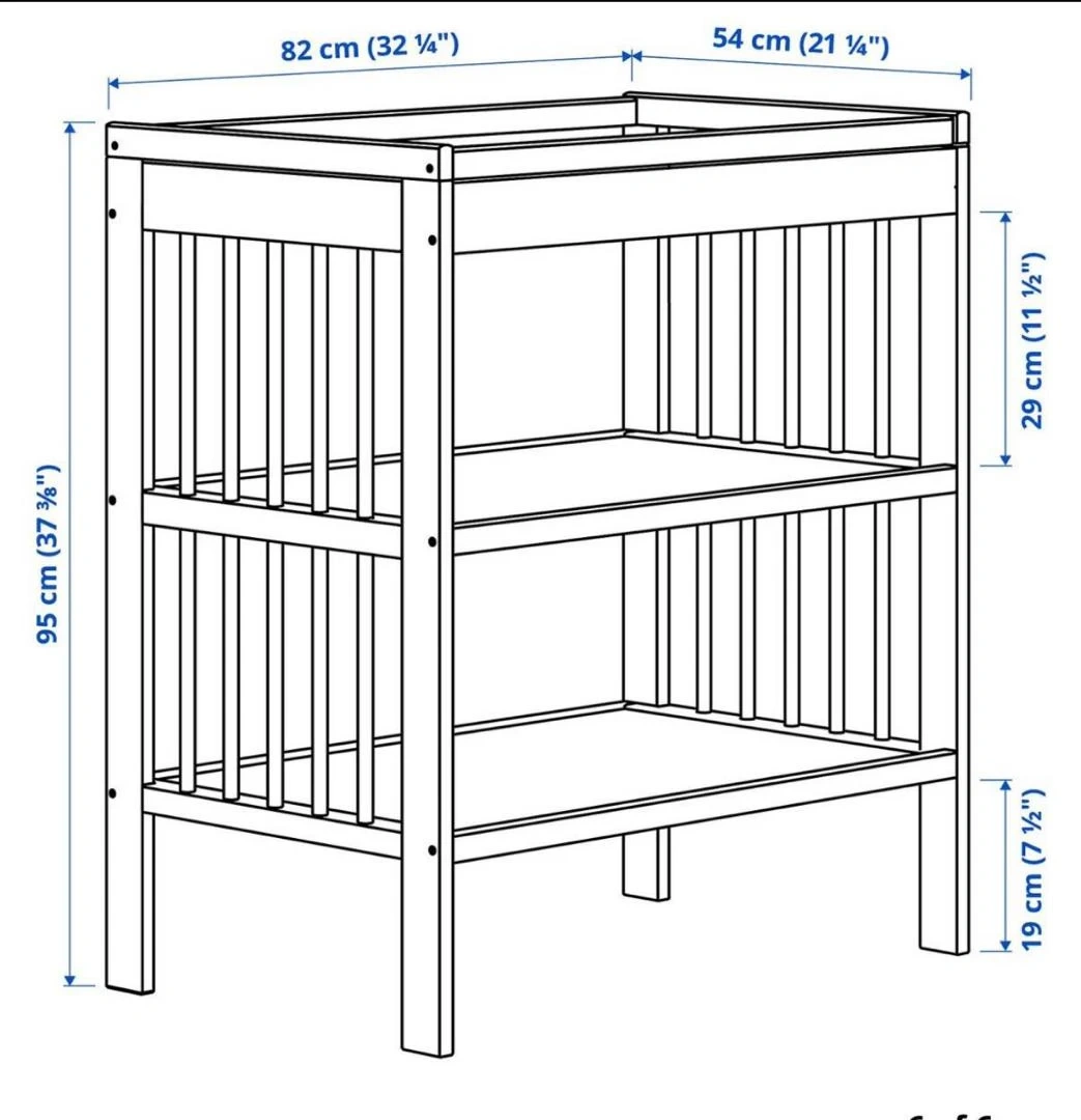 White changing table with two lower shelves. Overall height is 95 cm, width is 82 cm, and depth is 54 cm. The top changing area is 29 cm deep.