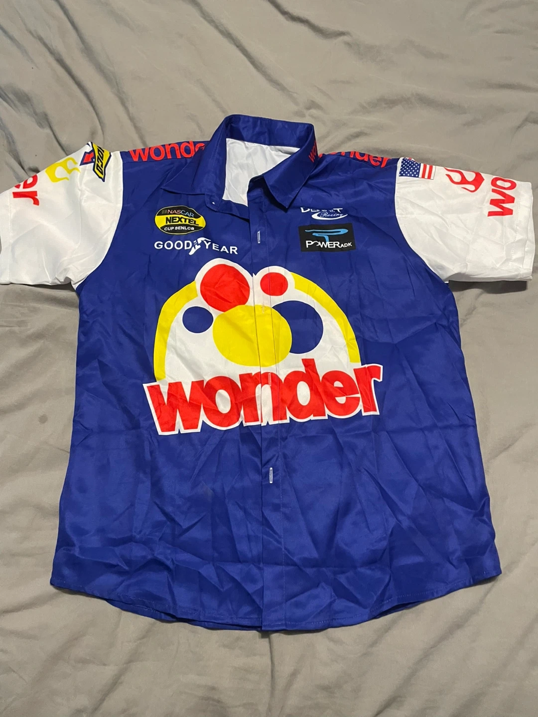 This is a short-sleeved button-up shirt with various racing sponsorships like Goodyear and NEXTEL. It's blue with white sleeves and features prominent "Wonder" branding. Material is polyester.