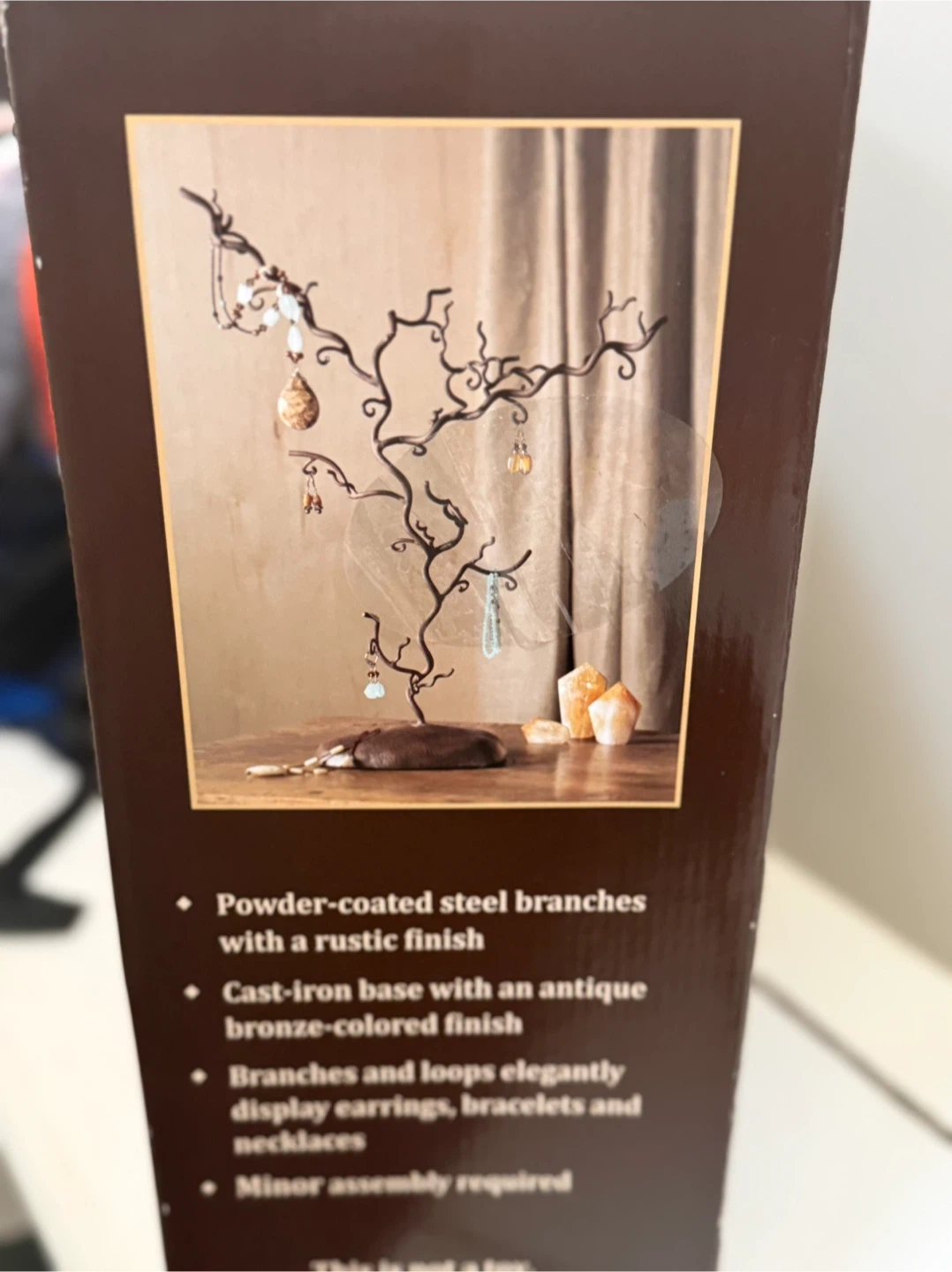 This jewelry tree features powder-coated steel branches with a rustic finish. It has a cast-iron base with an antique bronze-coloured finish. Branches and loops elegantly display earrings, necklaces, and bracelets. Minor assembly is required.