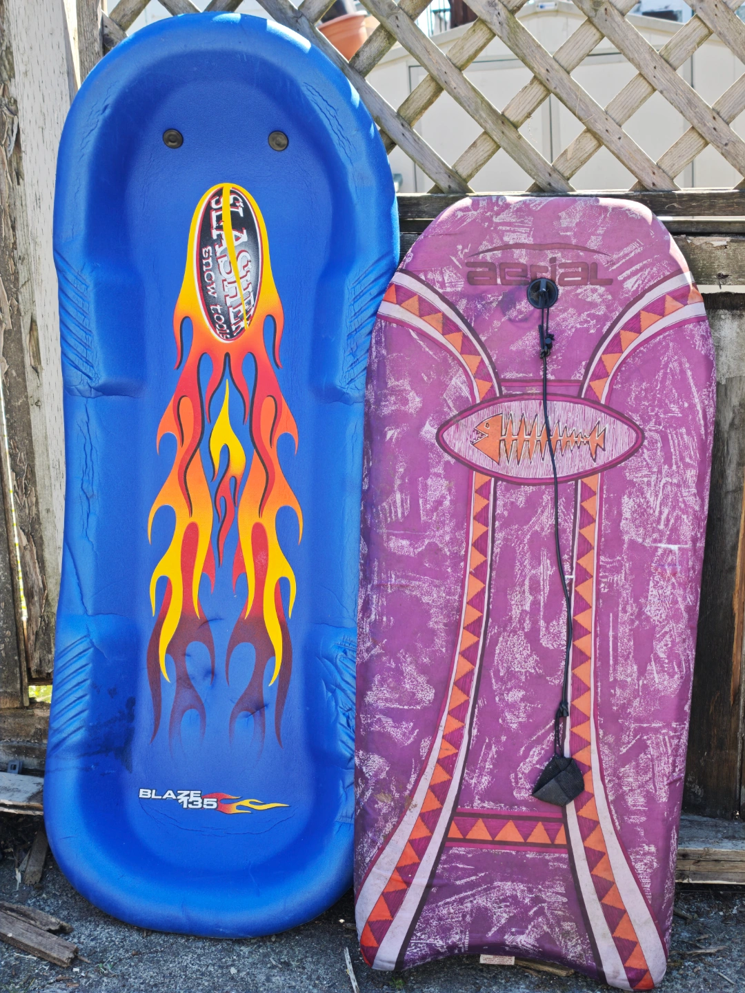 Pair of used winter and summer recreational items. Glacier Blaze 135 snow sled shows some wear. Purple Aerial boogie board also shows wear. Sold as is.
