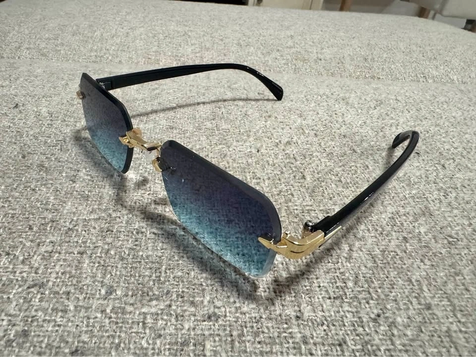 Stylish retro rimless sunglasses with a clean, modern look. Features blue/green gradient lenses with gold accents and black arms. They are lightweight and comfortable, perfect for everyday wear, driving, or adding a unique touch to your outfit.