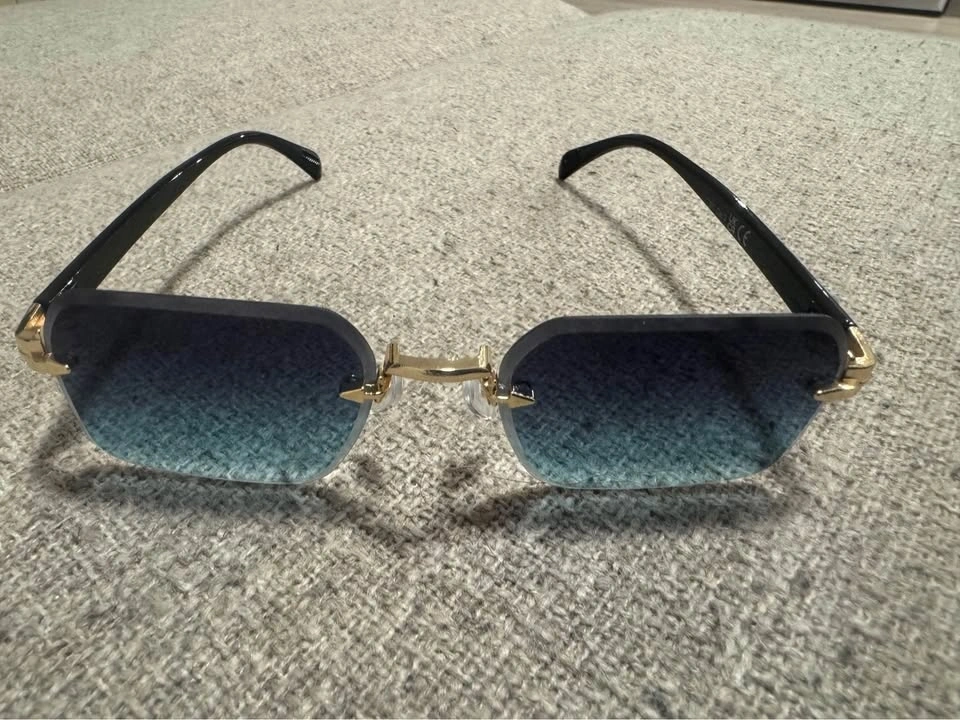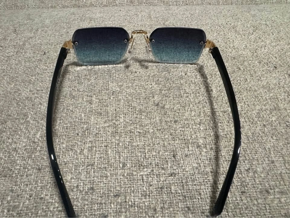Stylish retro rimless sunglasses with a clean, modern look. Features blue/green gradient lenses with gold accents and black arms. They are lightweight and comfortable, perfect for everyday wear, driving, or adding a unique touch to your outfit.