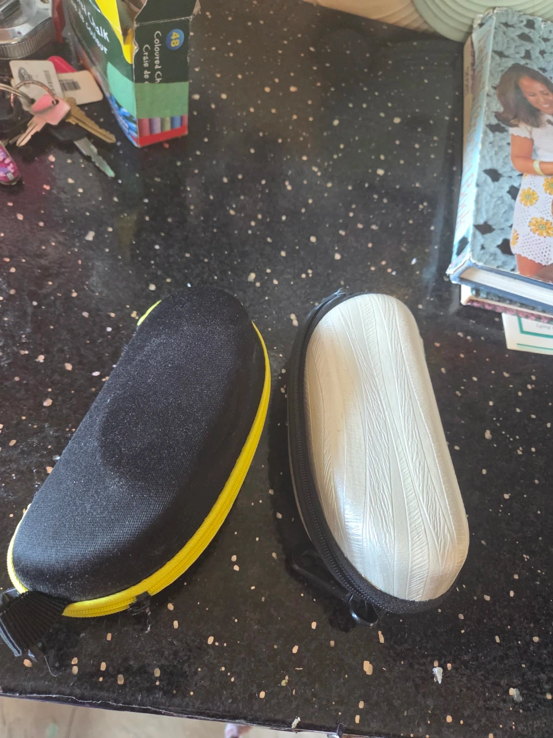 Selling two hard cases for eyeglasses or sunglasses. One is black with a yellow zipper, and the other is off-white with a textured finish and a black zipper. They offer good protection for your eyewear.