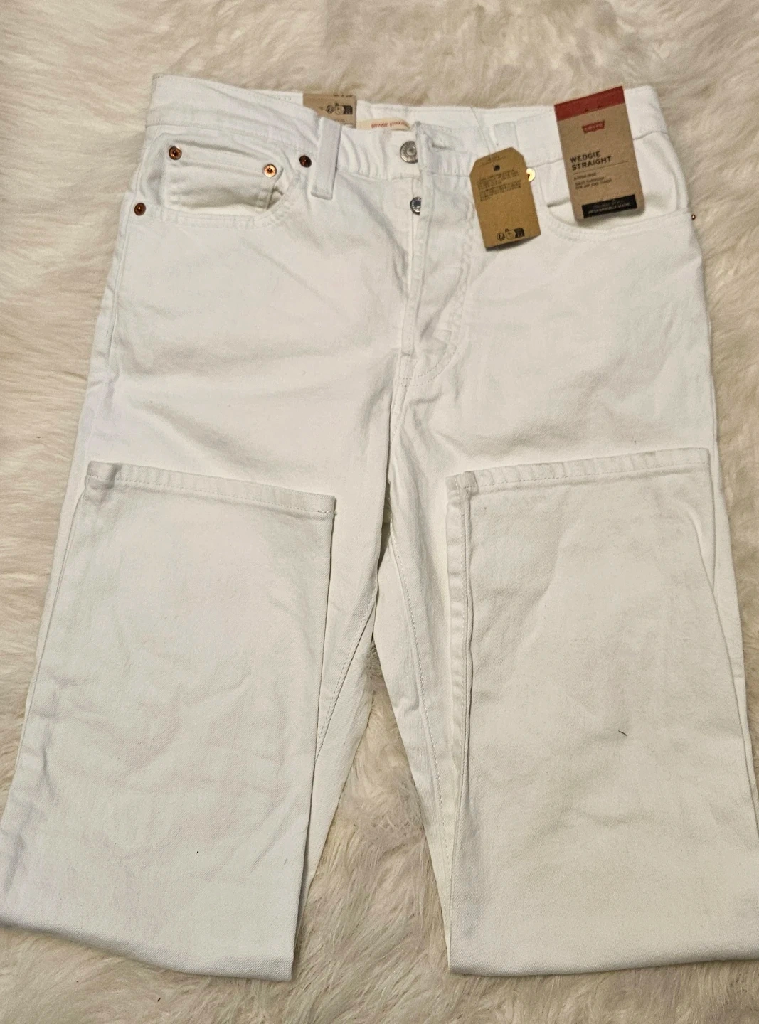 Levi's Wedgie Straight jeans in white. Women's size 30x28. Classic five-pocket styling. These jeans offer a snug fit through the hip and thigh, with a straight leg opening. They're a versatile staple for any wardrobe. Made with durable denim.