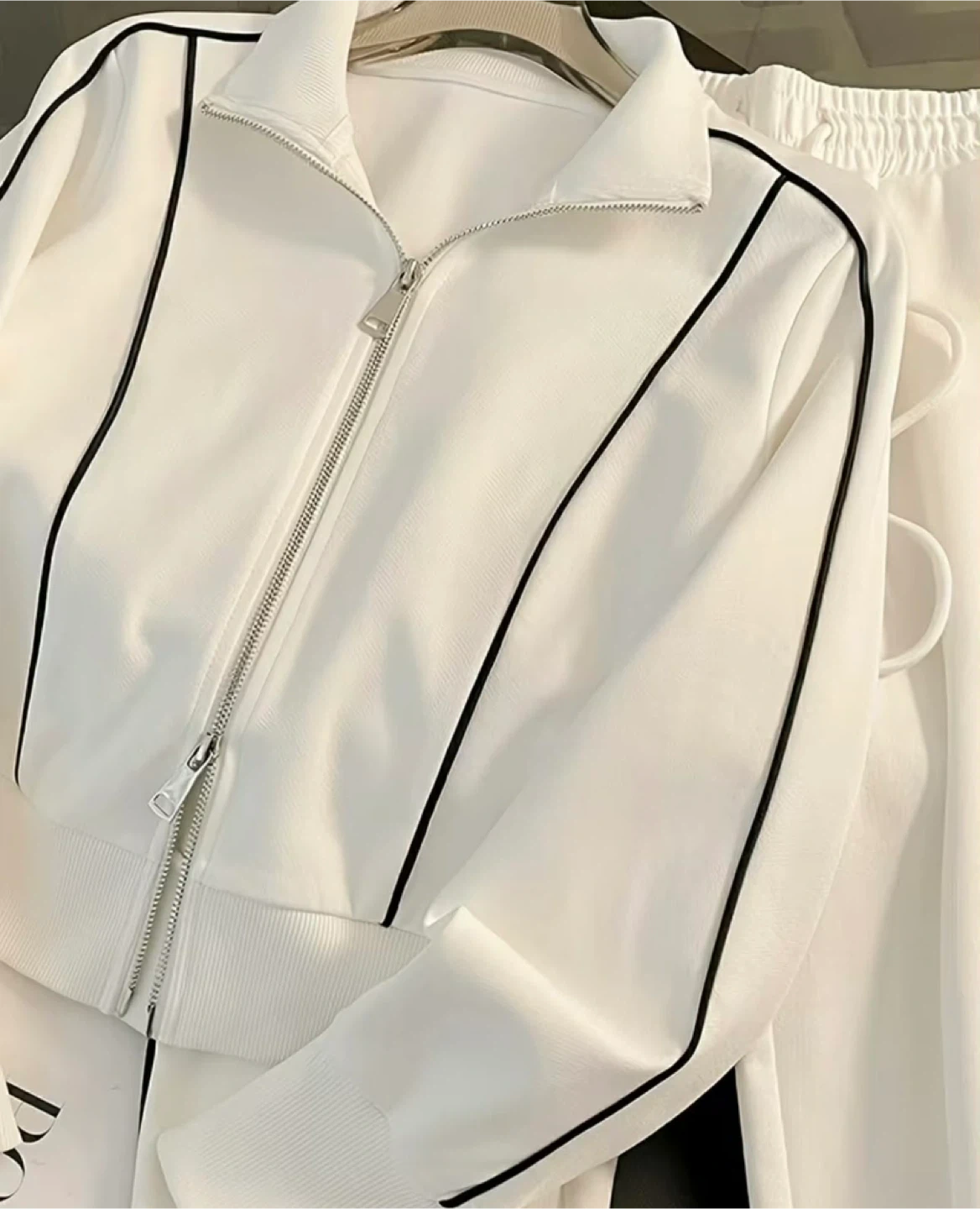 White tracksuit set featuring a zip-up jacket and matching pants. Black piping accents the sleeves, sides, and legs. Elastic waistband with drawstring. It's a comfortable set for casual wear!