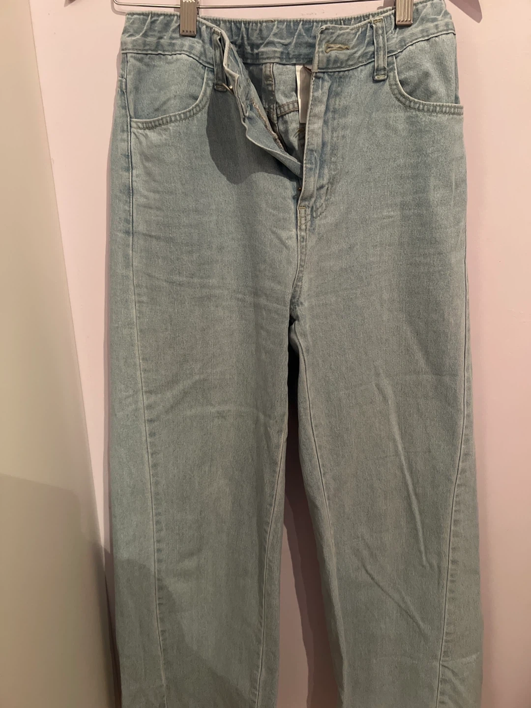 Light wash denim jeans with a wide leg silhouette. They feature a button and zipper closure with a relaxed fit. Made from 100% cotton.