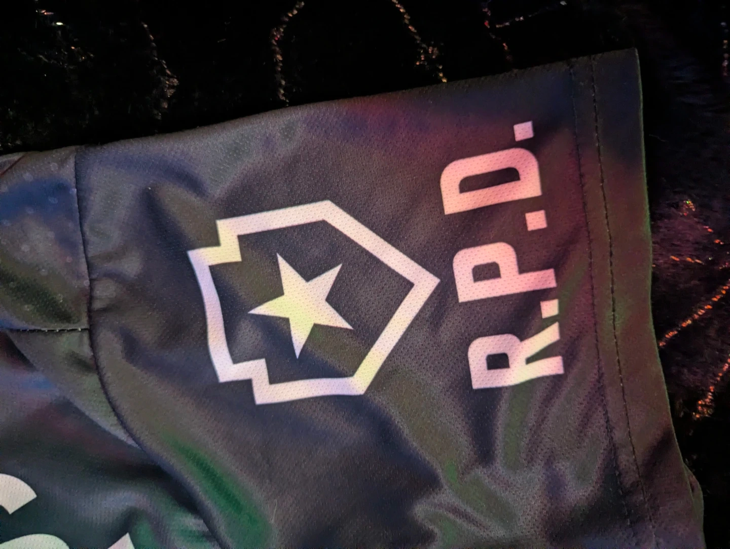 Black and blue short-sleeved t-shirt featuring the S.T.A.R.S. and Raccoon Police logos. Includes R.P.D. branding on the sleeve. This shirt is a great choice for fans of the series!