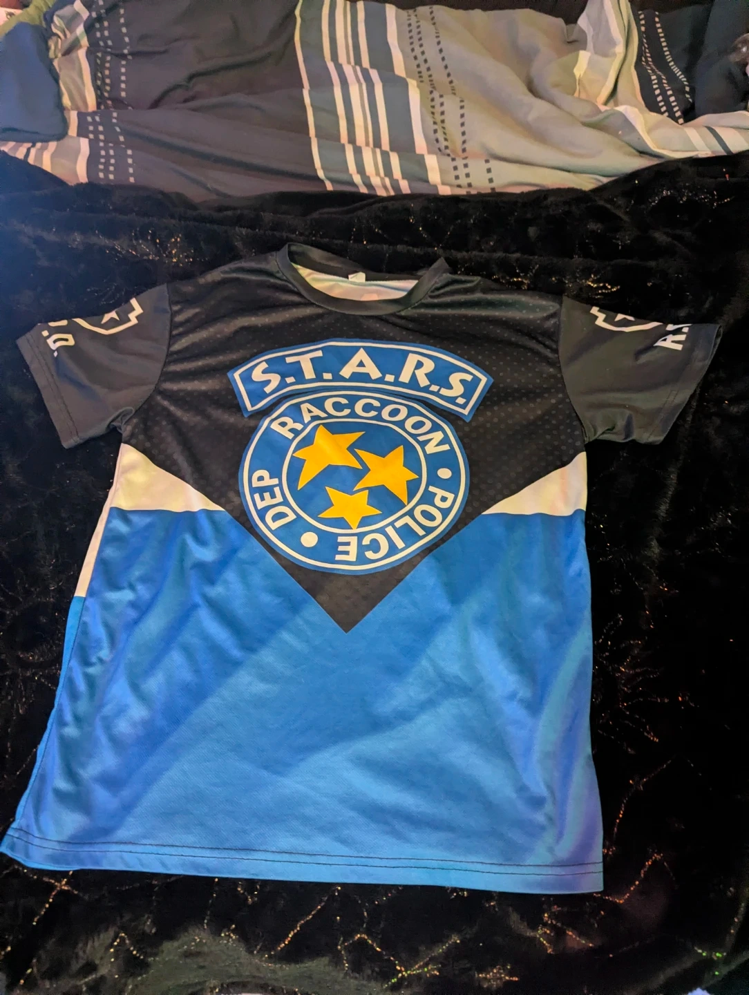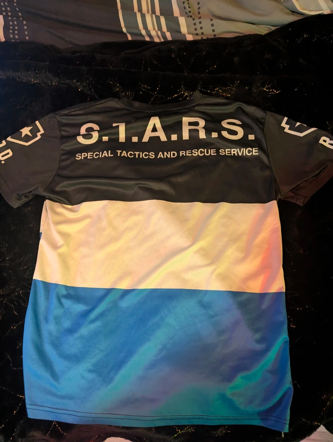 Black and blue short-sleeved t-shirt featuring the S.T.A.R.S. and Raccoon Police logos. Includes R.P.D. branding on the sleeve. This shirt is a great choice for fans of the series!