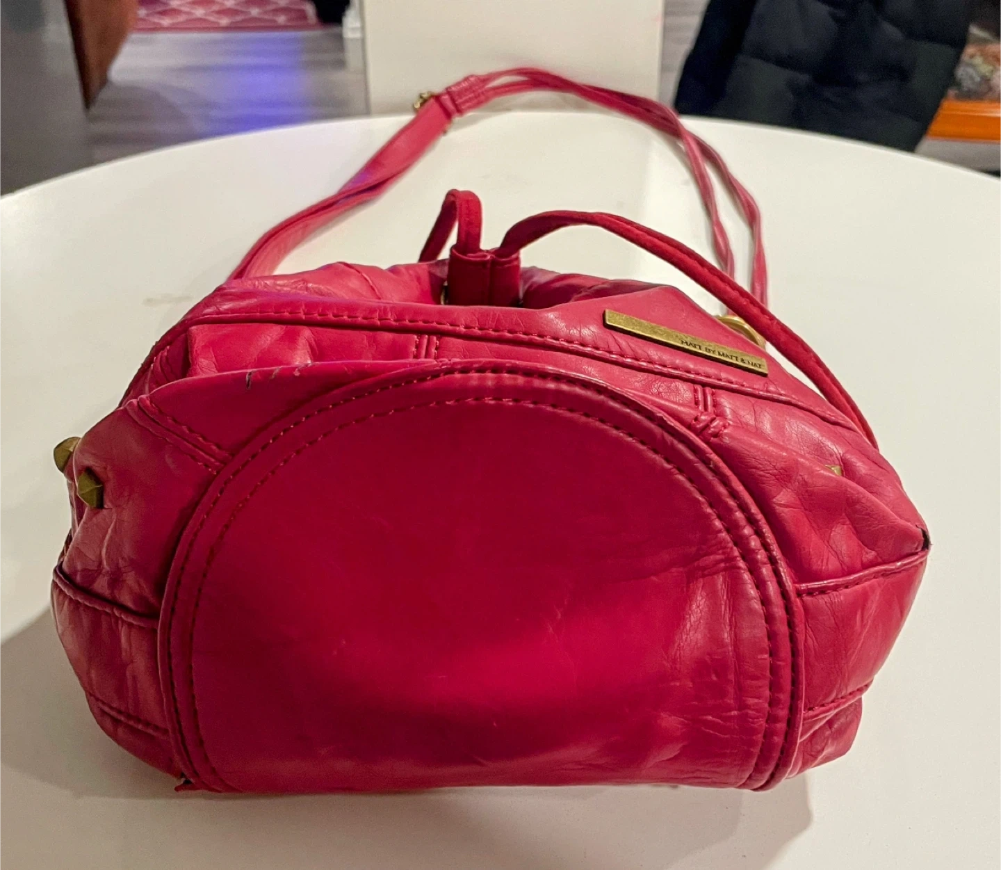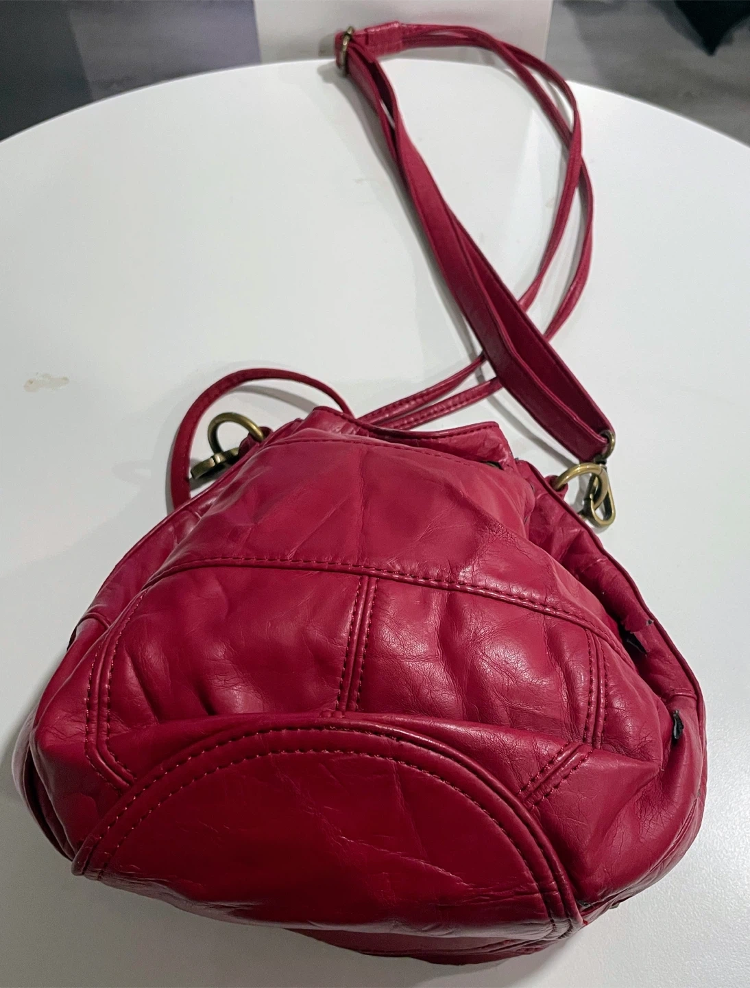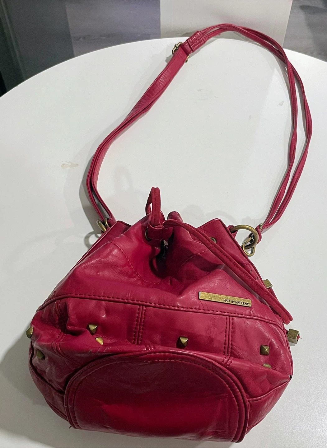 Selling a cute red bucket bag from Matt & Nat! It's in used condition, but still has lots of life left. The bag has a drawstring closure and a long shoulder strap. Perfect for everyday use! Used - good. Haven’t used it. Need it gone asap!$5 item. Pick up only! No Deliveries! Cash or E-Transfers is preferred! MSG me if you’re interested in coming to buy the item asap! MSG me for more information. Side door and don’t go to the front door.