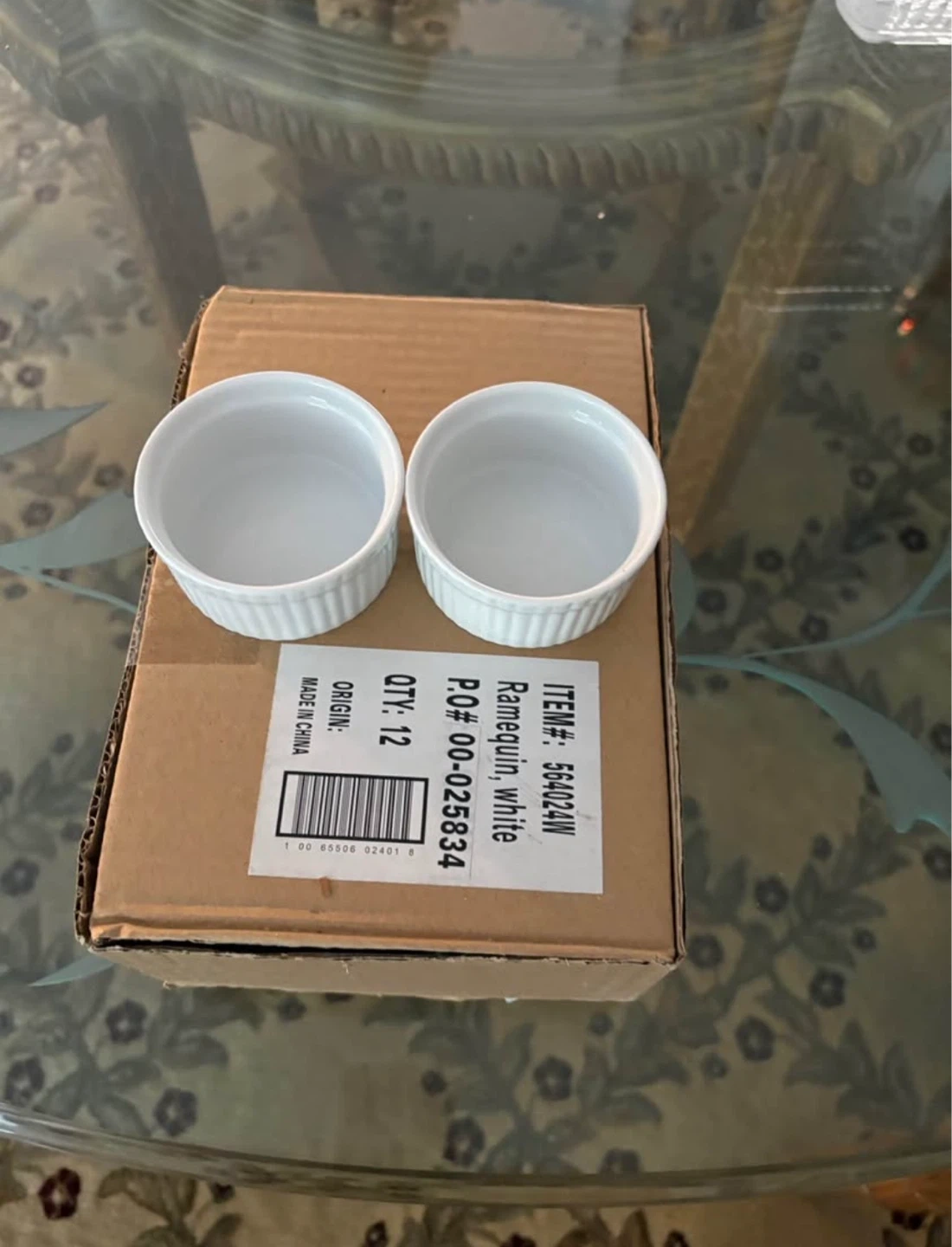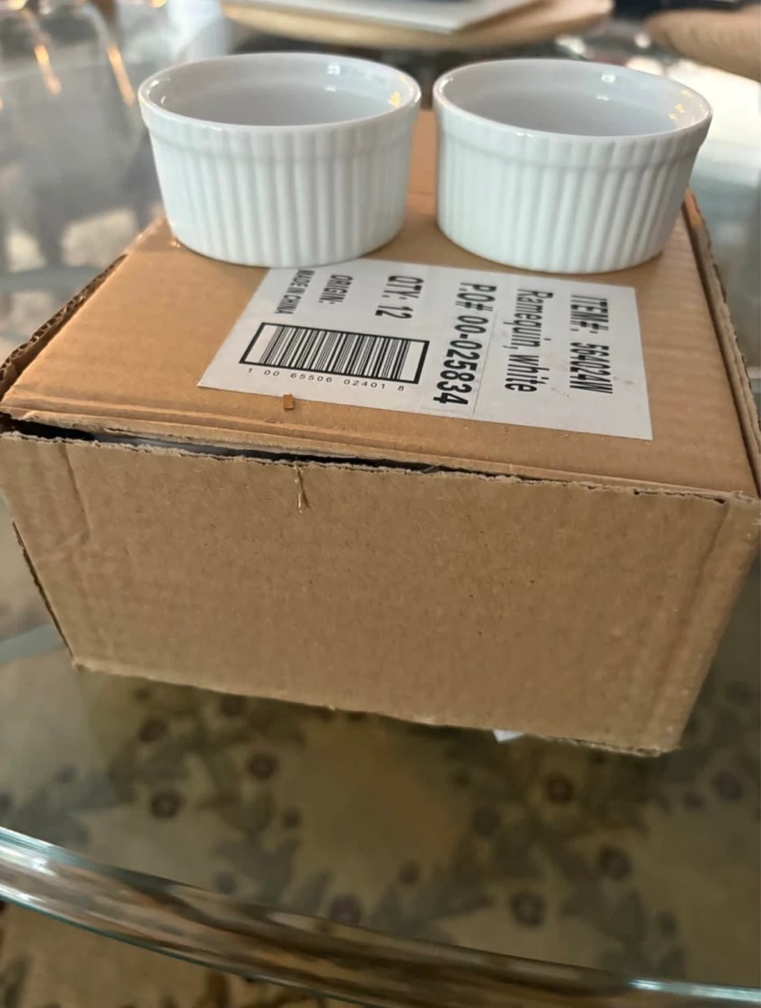 These are white, ribbed porcelain ramequins box packaged in a quantity of 12.