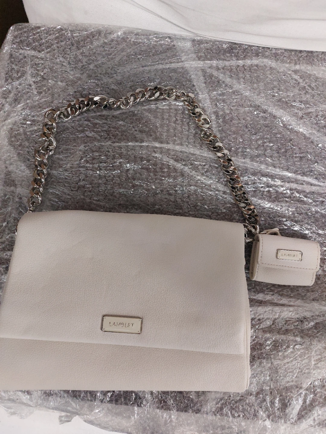 Selling a Lambert shoulder bag in white. It's in great condition and comes with a chain strap and a small coin purse. Perfect for everyday use or a night out!