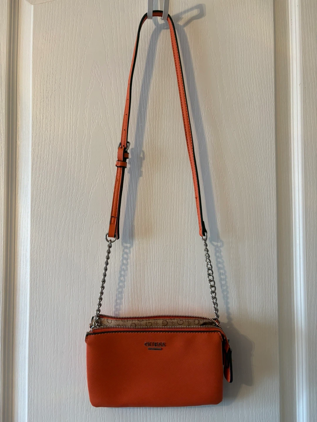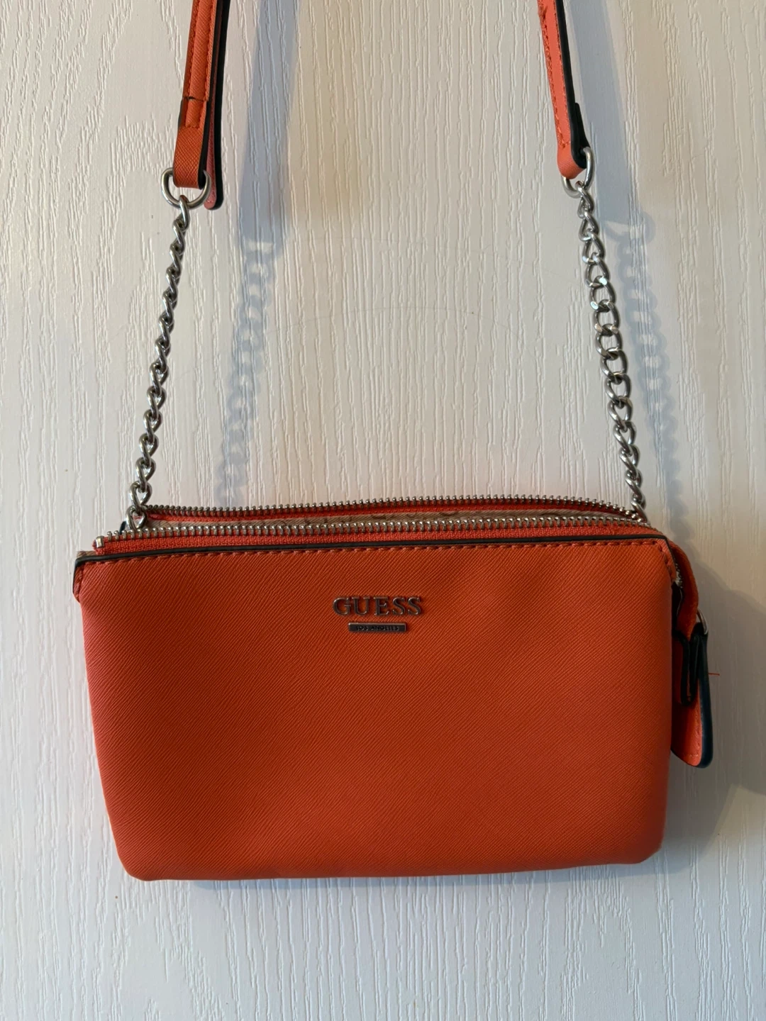 This is a vibrant orange Guess crossbody bag with a chain strap. It features a faux-leather exterior and a patterned interior with multiple compartments. It's a stylish accessory for everyday use!
