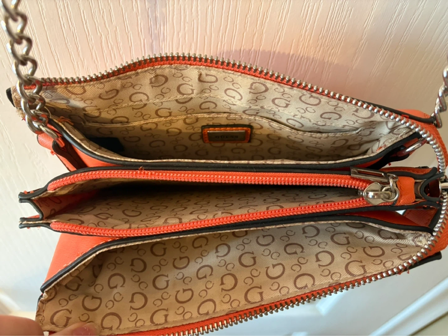 This is a vibrant orange Guess crossbody bag with a chain strap. It features a faux-leather exterior and a patterned interior with multiple compartments. It's a stylish accessory for everyday use!