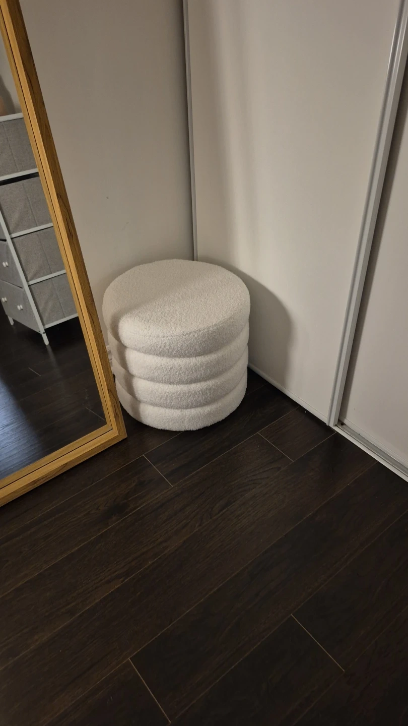 Selling a cute white round boucle ottoman! It's in great condition and would be a lovely addition to any room. The soft texture and round shape make it a comfy footstool or extra seating option