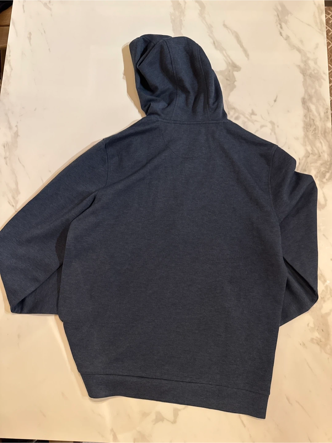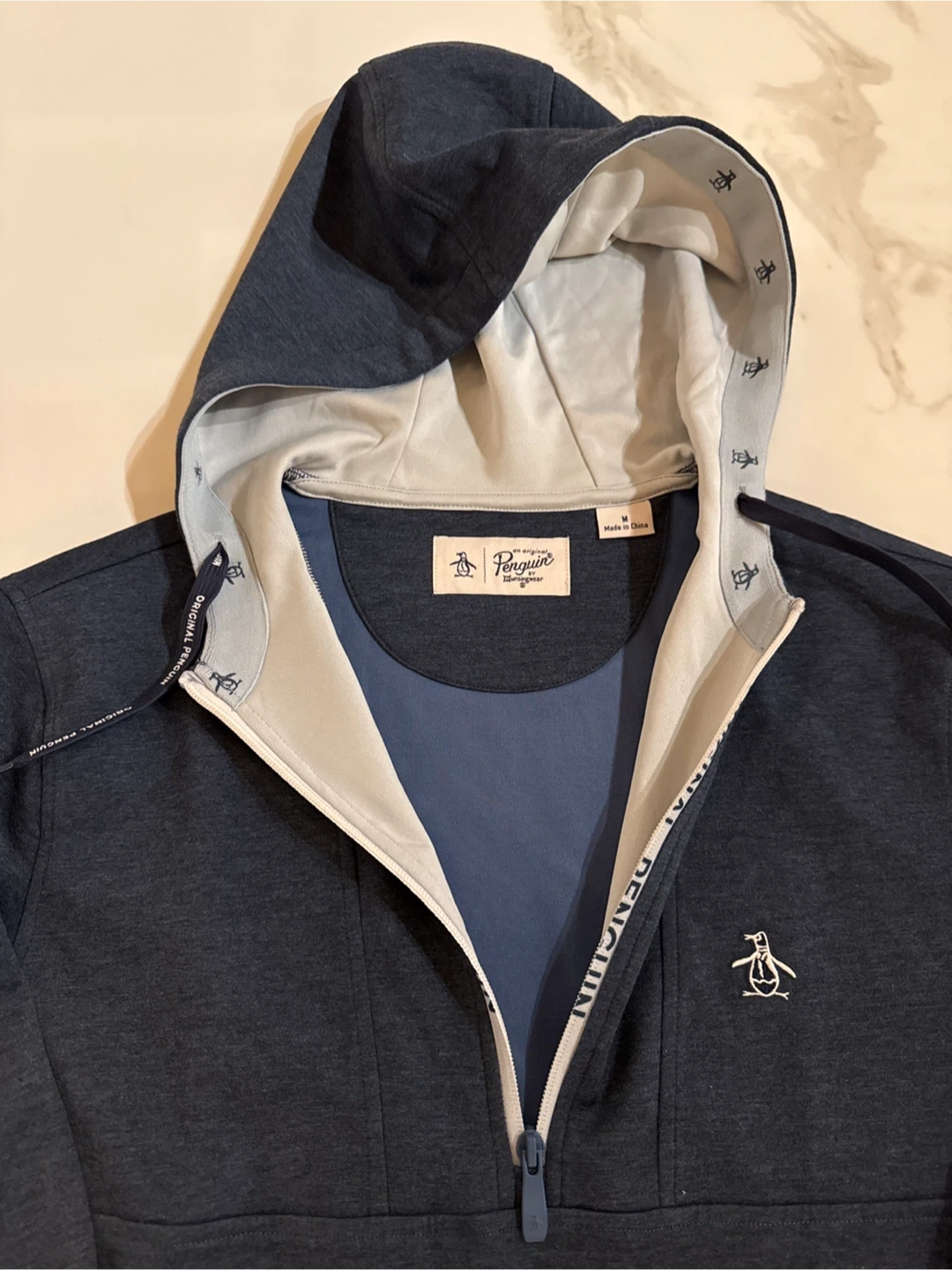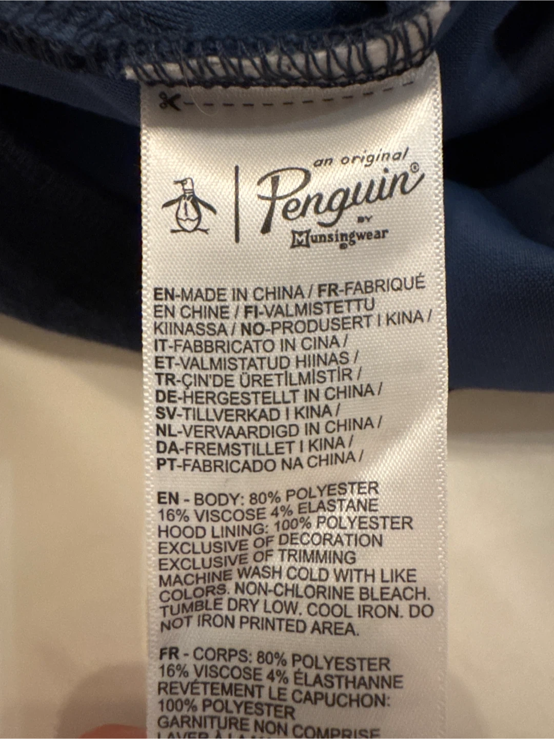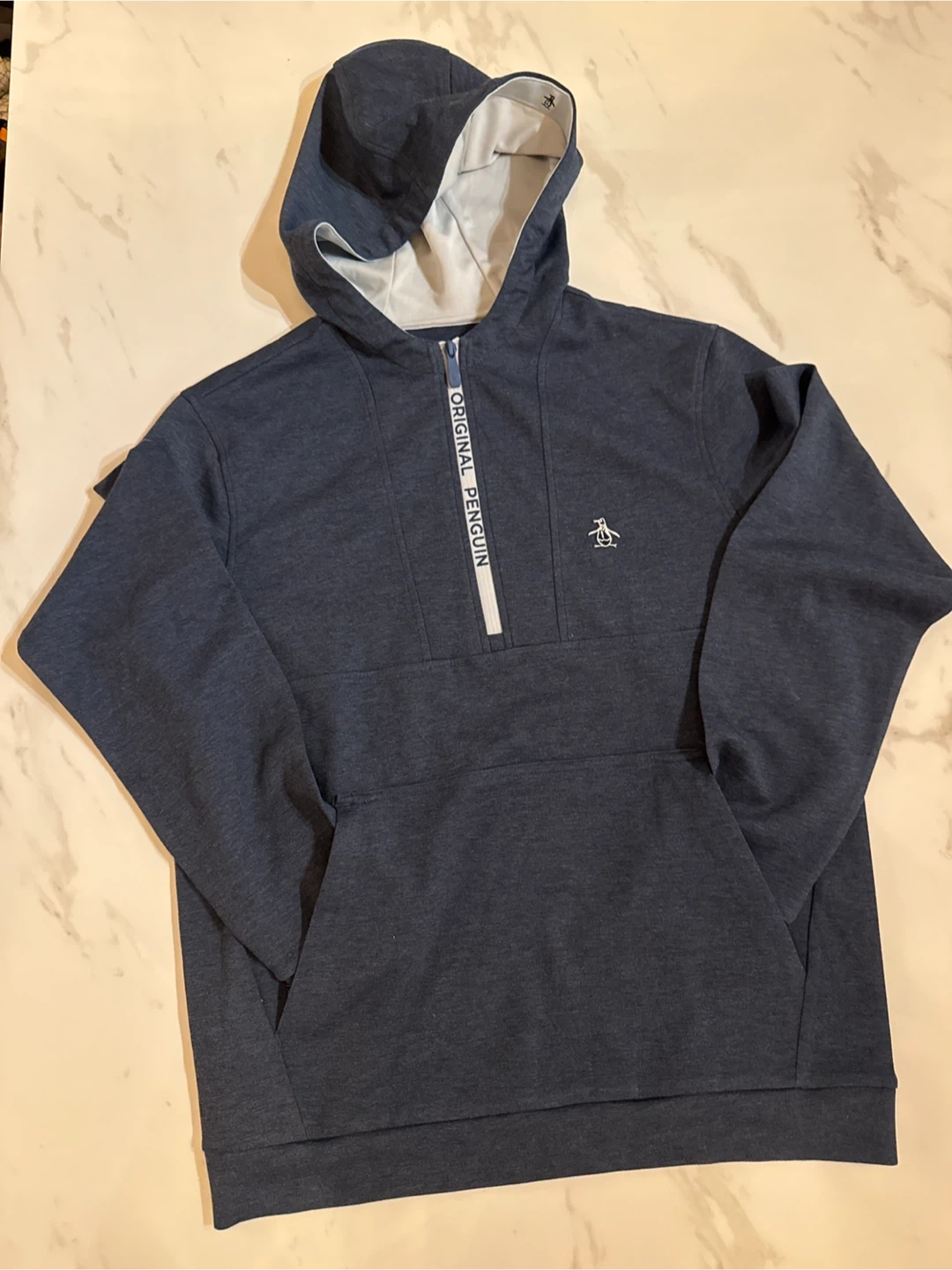 Selling a gently used Original Penguin hoodie in navy blue. It's a size medium and made with 80% polyester, 16% viscose, and 4% elastane. The hood lining is 100% polyester. It's a comfortable and stylish hoodie!