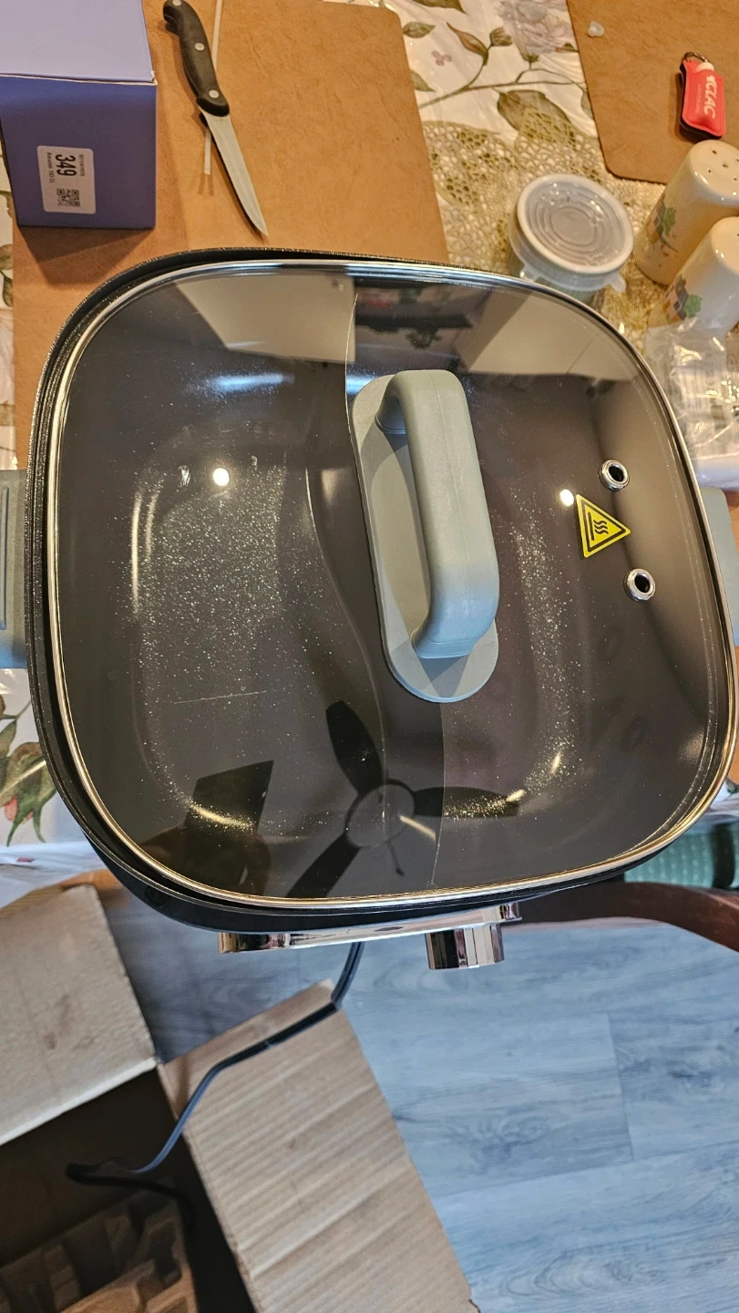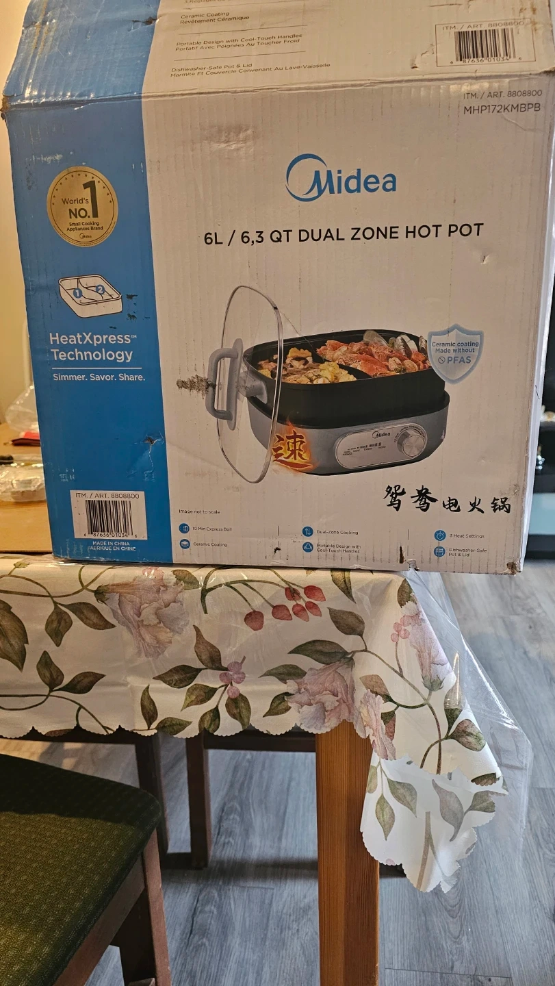 This is a Midea 6L dual zone hot pot with HeatXpress Technology. It has a ceramic coating and multiple power settings. Includes a glass lid with a handle.
