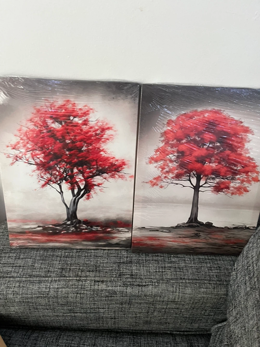 This set includes three canvas prints featuring a striking red tree design. Each piece is individually wrapped for protection. These prints would add a pop of colour to any room's decor.