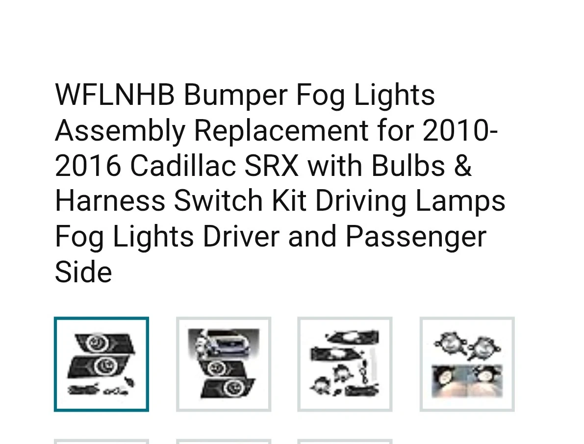 This is a complete fog lights assembly replacement kit for 2010-2016 Cadillac SRX models. It includes the driver and passenger side fog lights with bulbs, a harness, and a switch kit. Everything you need to install is included, making it a convenient upgrade for your vehicle.