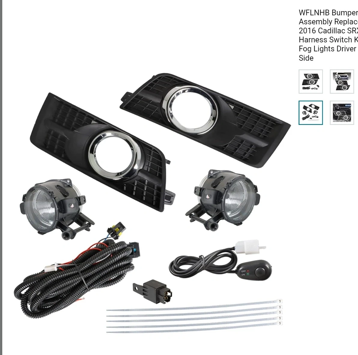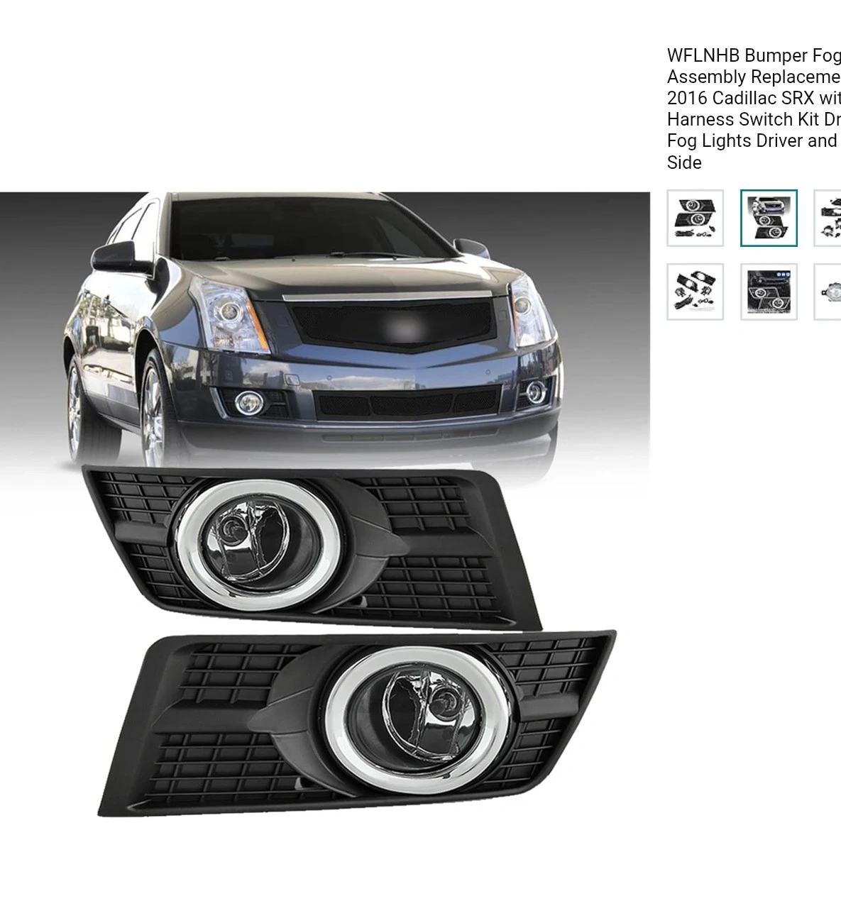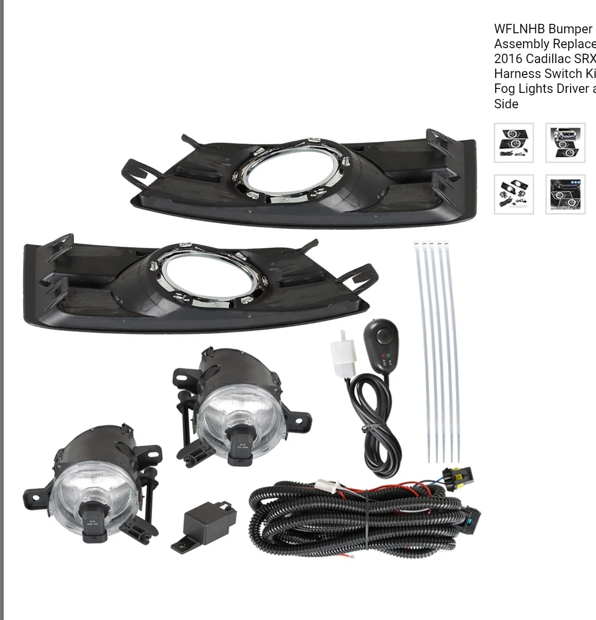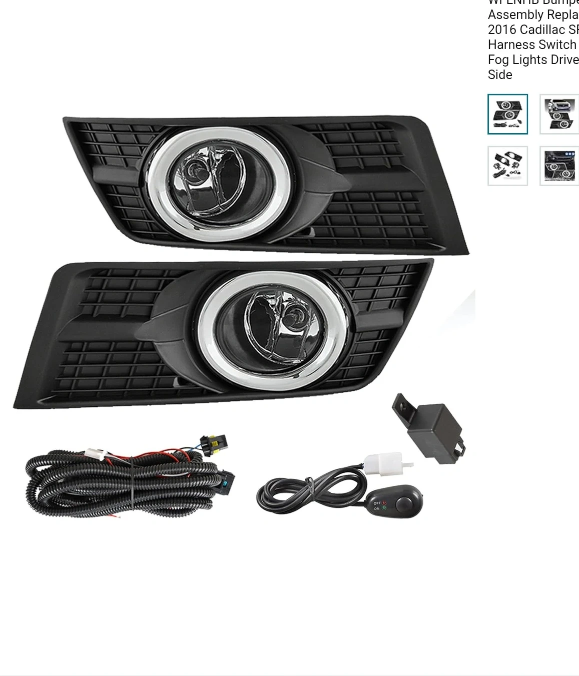 This is a complete fog lights assembly replacement kit for 2010-2016 Cadillac SRX models. It includes the driver and passenger side fog lights with bulbs, a harness, and a switch kit. Everything you need to install is included, making it a convenient upgrade for your vehicle.