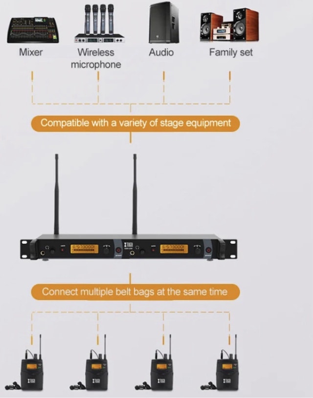 The IEM1200 2-Pack Wireless In-Ear Monitor System (XTUGA brand), is a budget-friendly, UHF-band system for stage performers, providing wireless monitoring for two users with transmitter, two bodypack receivers (with earphones), antennas, and cables, featuring PLL synthesis, 40 channels, and a 300ft range, ideal for replacing traditional monitors on a budget. Key Features & Specifications: Brand: XTUGA (also seen as Tiwa). Type: UHF Wireless In-Ear Monitor System. Channels: 2-channel, with 40 switchable frequencies. Range: Up to 300 feet (100 meters). Components: Includes 1 Transmitter, 2 Bodypack Receivers (with earphones), 2 Antennas, Power Adapter, and Cables. Power: Receivers use 2 AA batteries, offering 5-8 hours of life. Design: Features LCD displays, robust metal housing, and built-in limiters to prevent distortion. Connectivity: XLR/AUX inputs on the transmitter, 3.5mm headphone jack. Usage: Replaces bulky wired monitor setups for stage performances, offering clear, reliable sound for musicians.