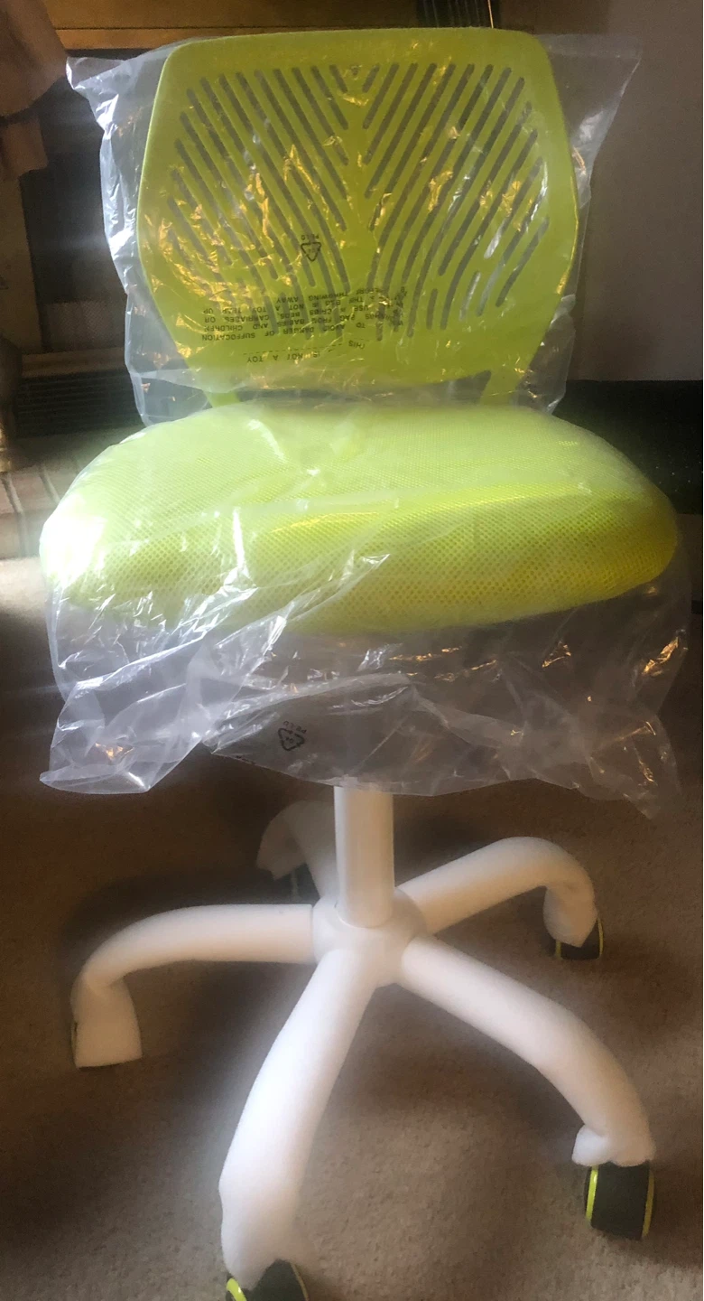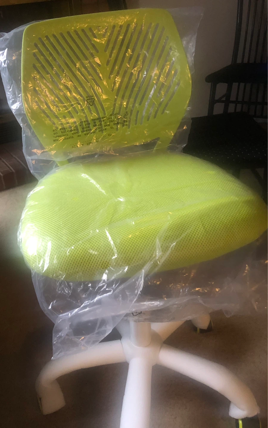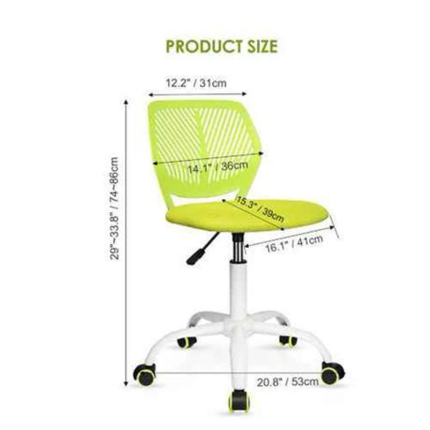 This is a lime green swivel desk chair with adjustable height. Seat width is 15.3"/39cm and seat depth is 16.1"/41cm. Overall height is adjustable from 29"-33.8"/74-86cm. It has a sturdy base with wheels for easy mobility.